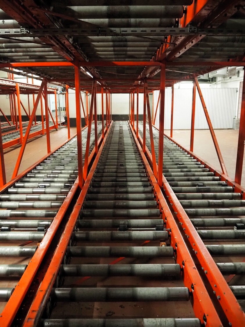 • Pallet storage system, steel rollers, roller width: 850 mm, total dimensions: 18800 mm x 5750 mm x 3220 mm