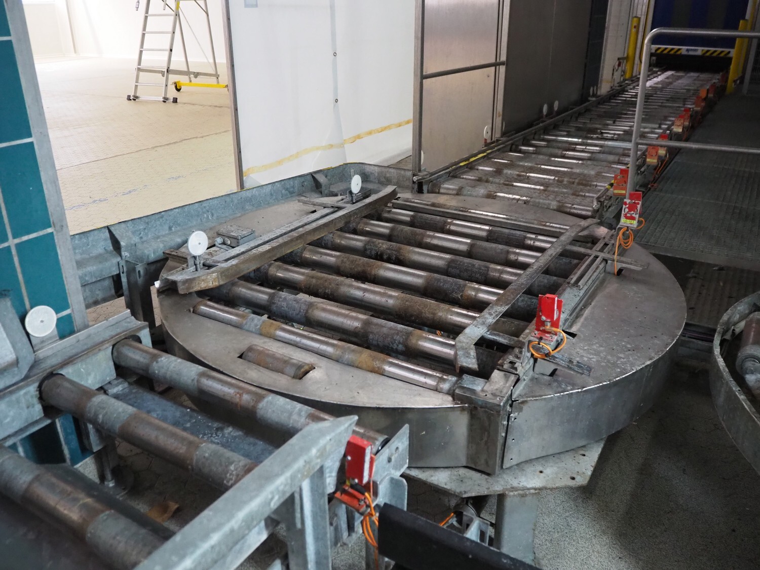• Pallet roller conveyor system, steel rollers, roller width: 900 mm, with 2 turning stations, total dimensions: 11800 mm x 7000 mm x 1650 mm