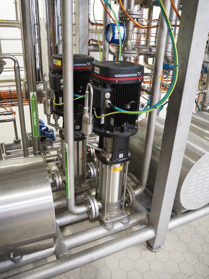 • SKID A: Balance tank for product, Fristam (booster) product pumps, Grundfos water pumps, process and steam valves, piping, ROI-box with Recorder