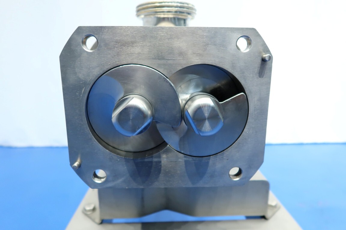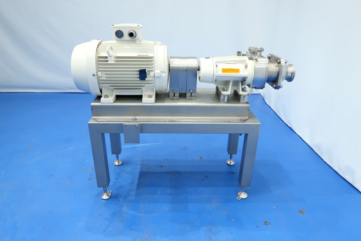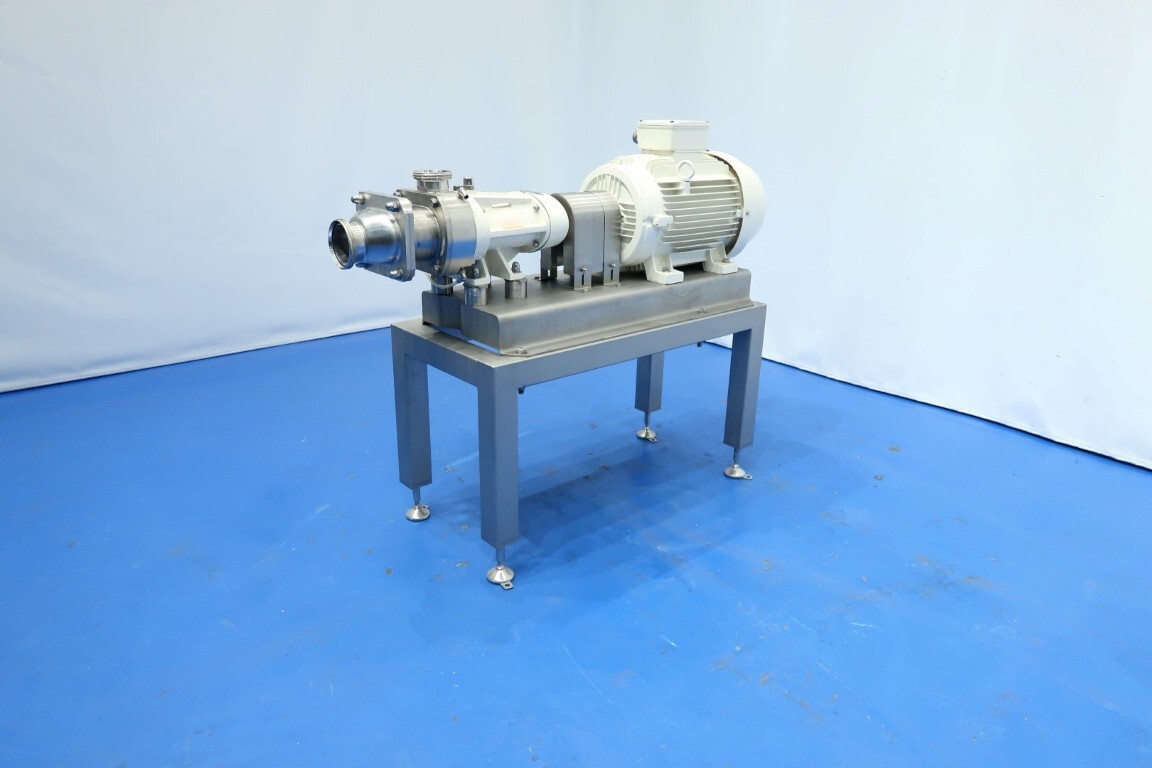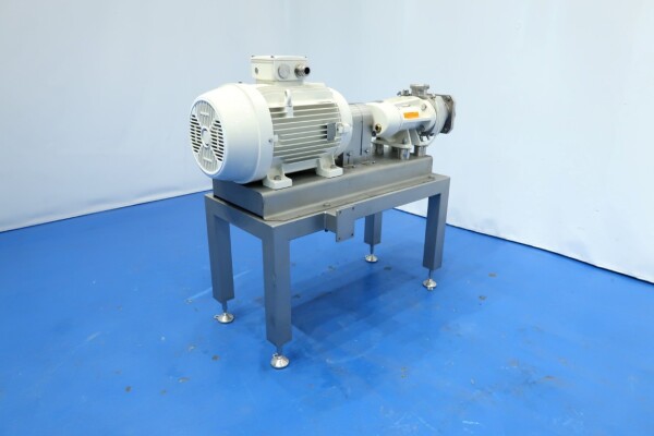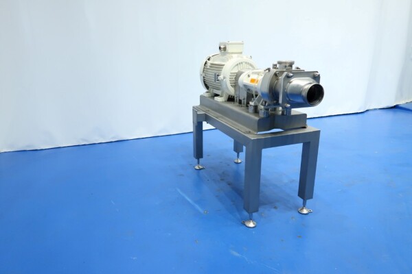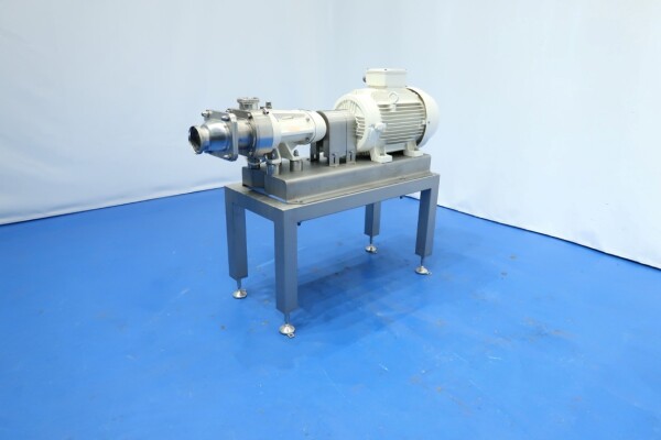Twin screw pump 'As new' practically unused. Built on firm SS frame with 4 adjustable feet. The 2-in-1 principle CIP and product in 1. Capacity product with 500 cSt @ 500 rpm: 20.000 ltr/h @ 0 bar and ca. 4.000 ltr/h @ 16 bar. Capacity CIP with 1 cSt @ 3.000 rpm: 100.000 ltr/h @ 0 bar and 70.000 ltr/h @ 8 bar. Current motor: 18,5 kW - 36,1 A - 975 rpm. Screw diameter: 120 mm. 2x Flushed seal / double acting mechanical seal. Job No. NZ 811174. Connections: (in) DN100 Din / (out) DN80 Din.