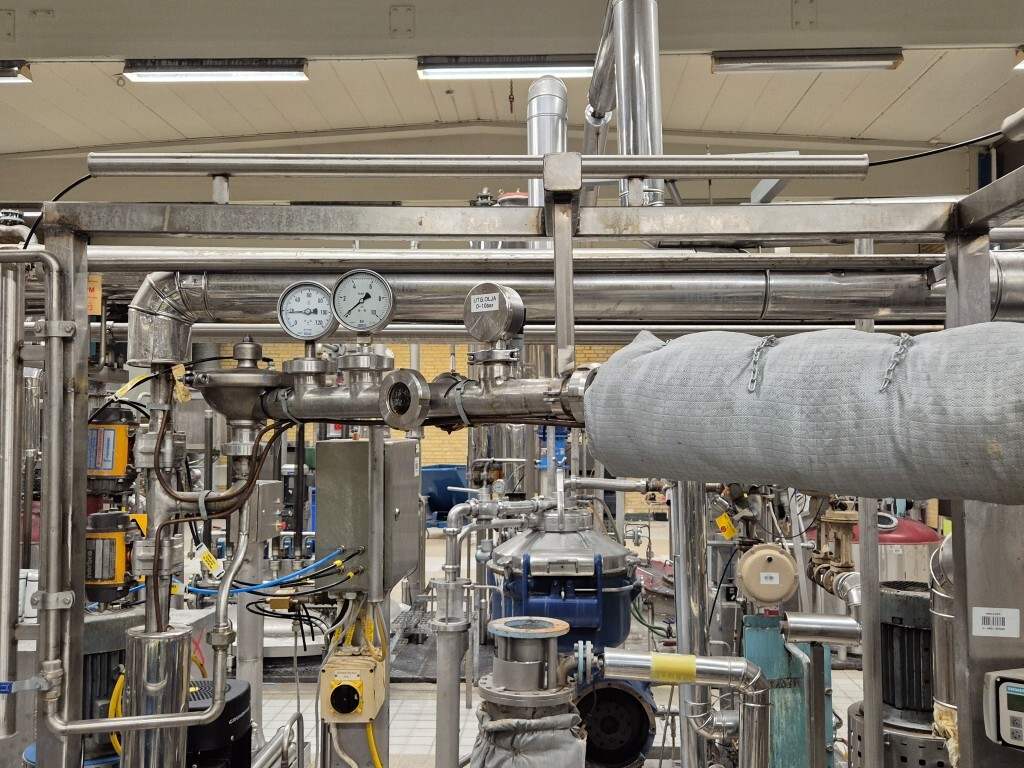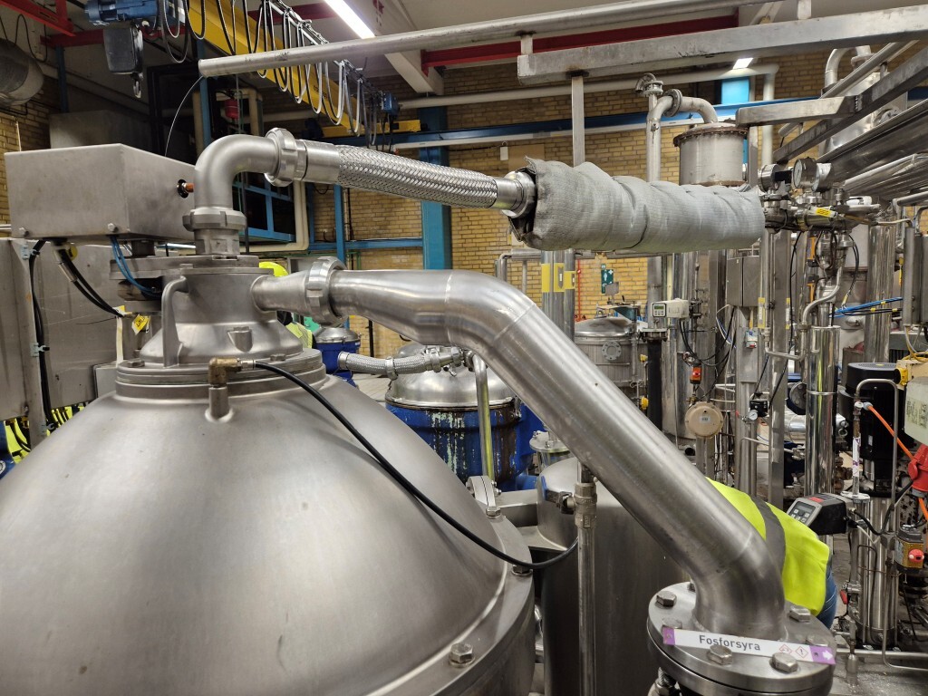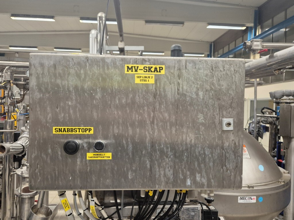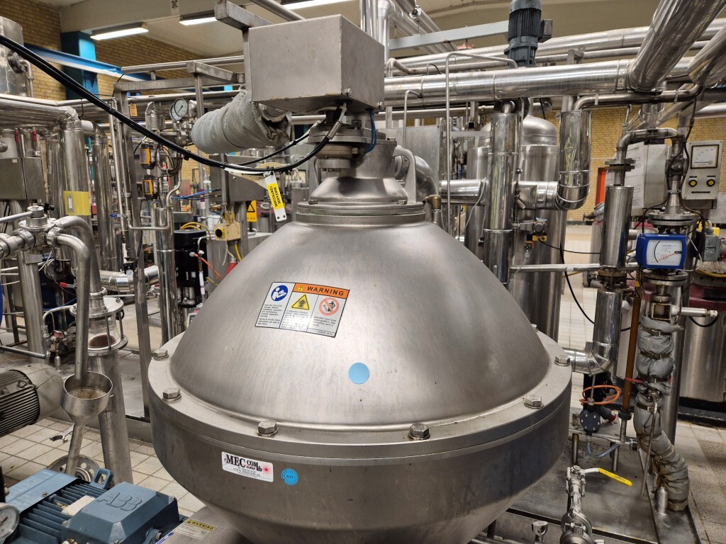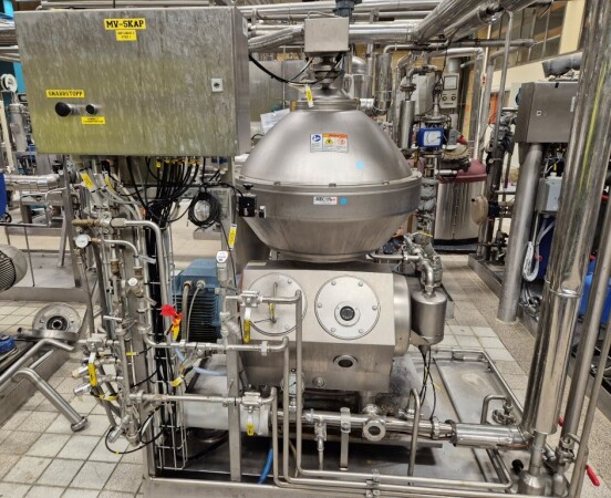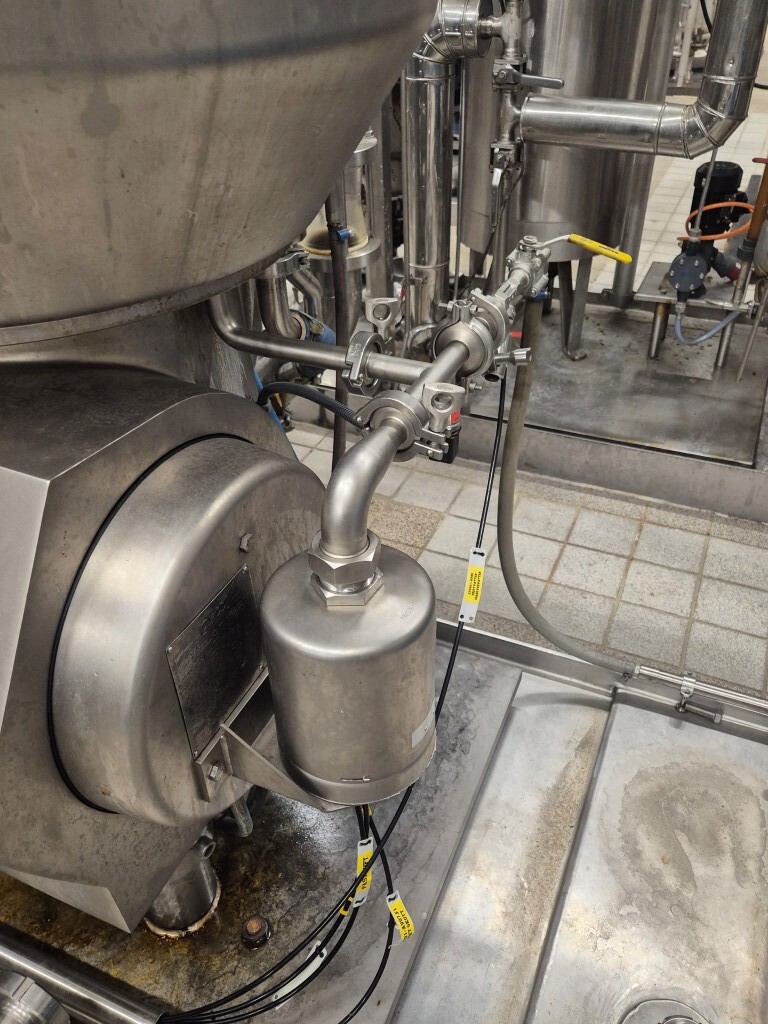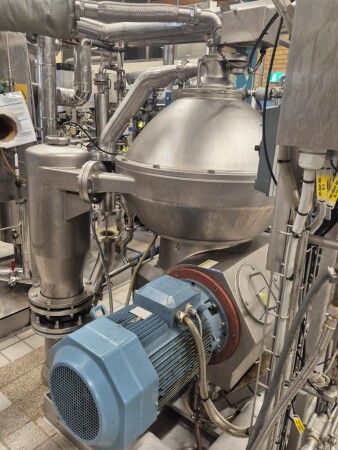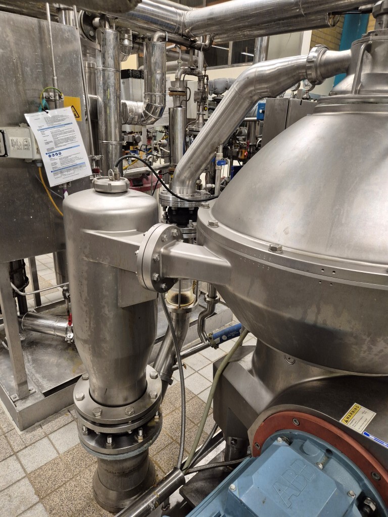 The PX 65 features a semi-hermetic design with a hermetic, bottom-fed inlet that ensures gentle, non-destructive acceleration of the feedstock to full bowl speed. The inlet flow area is optimized to minimize pressure drop, and the open outlets for the heavy and light phases further reduce resistance, resulting in low feed-pressure requirements. The outlets are equipped with stationary paring devices: a fixed paring disc for the light phase and adjustable paring tubes for the heavy phase. The PX 65 is supplied complete with motor, OWM, foundation frame, and tools.