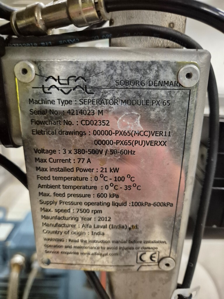 The Alfa Laval PX 65 centrifuge is designed for the vegetable oil and animal fat refining industries, with applications including continuous degumming, neutralizing, dewaxing, and washing of fatty oils such as vegetable oils, lard, tallow, and fish oil.