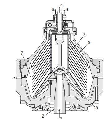 During operation, the feed enters the separator bowl from the bottom through a hollow spindle (1) and passes into the disc stack (2). The heavy phase and sludge are forced toward the bowl periphery, while the light phase flows toward the center (3) and is pumped out (4) for further processing. The heavy phase moves over a top disc (5) into a chamber and is discharged via an adjustable paring device (6). Sludge collects in the sludge space (7) and is discharged automatically at preset intervals by a hydraulic system, which lowers the sliding bowl bottom (8) to open the sludge ports. The discharged sludge is collected in the frame and exits the centrifuge via a cyclone.