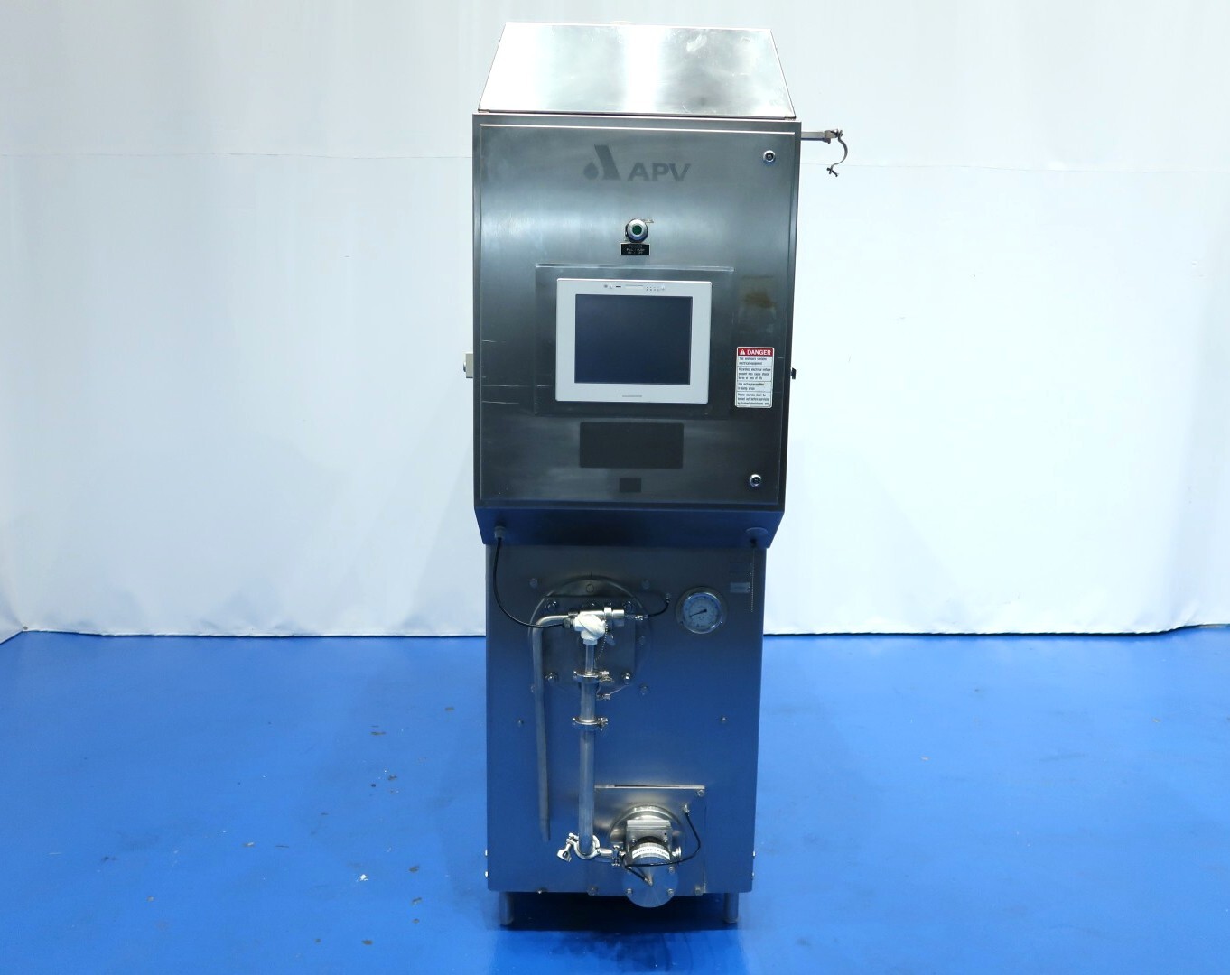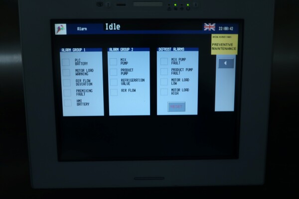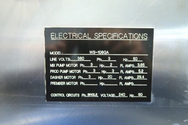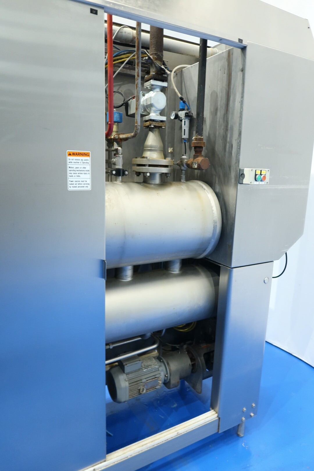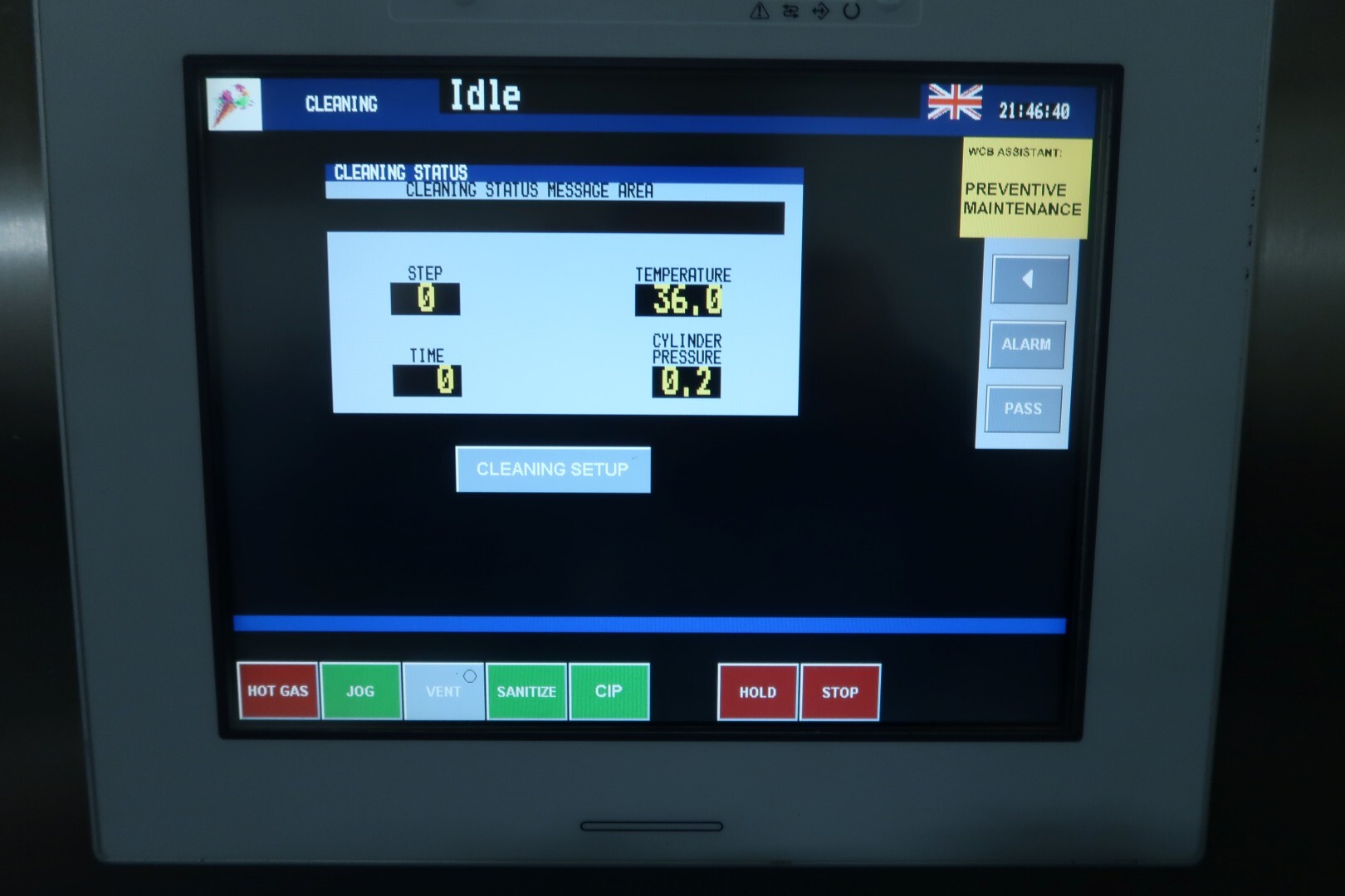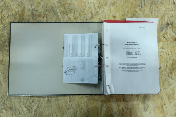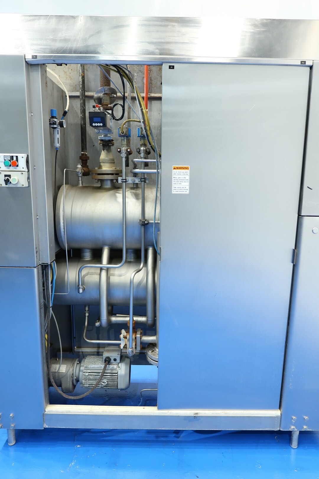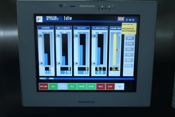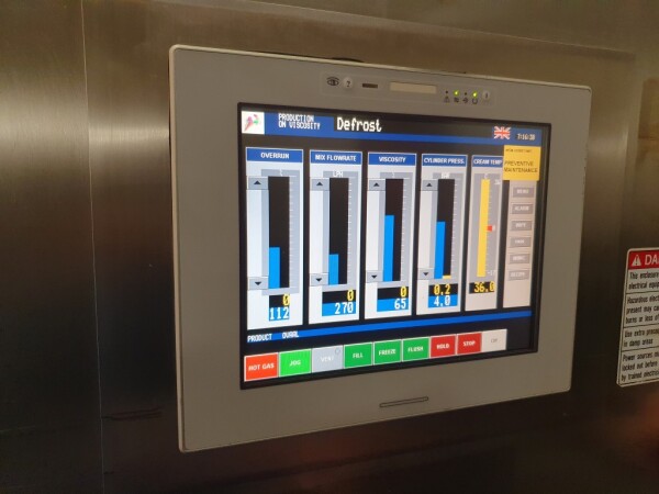 Congélateur continu pour la production de glace, avec un cylindre, des racloirs neufs et un système de réfrigération à ammoniaque (NH₃). Équipé de pompes et d’un automate Siemens Simatic S7 avec écran tactile. Entretien récent sur le dash, le cylindre et les pompes (rapport disponible). Raccordements : pompe produit 2" Tri-Clamp, pompe mélange 1,5" Tri-Clamp. Capacité nominale basée sur un mix contenant 10,5% de matière grasse, 37,5% d’extrait sec et une composition standard de sucre/stabilisant. Température d’entrée 4,4°C, sortie -5,5°C. Capacité de refroidissement à -33°C.