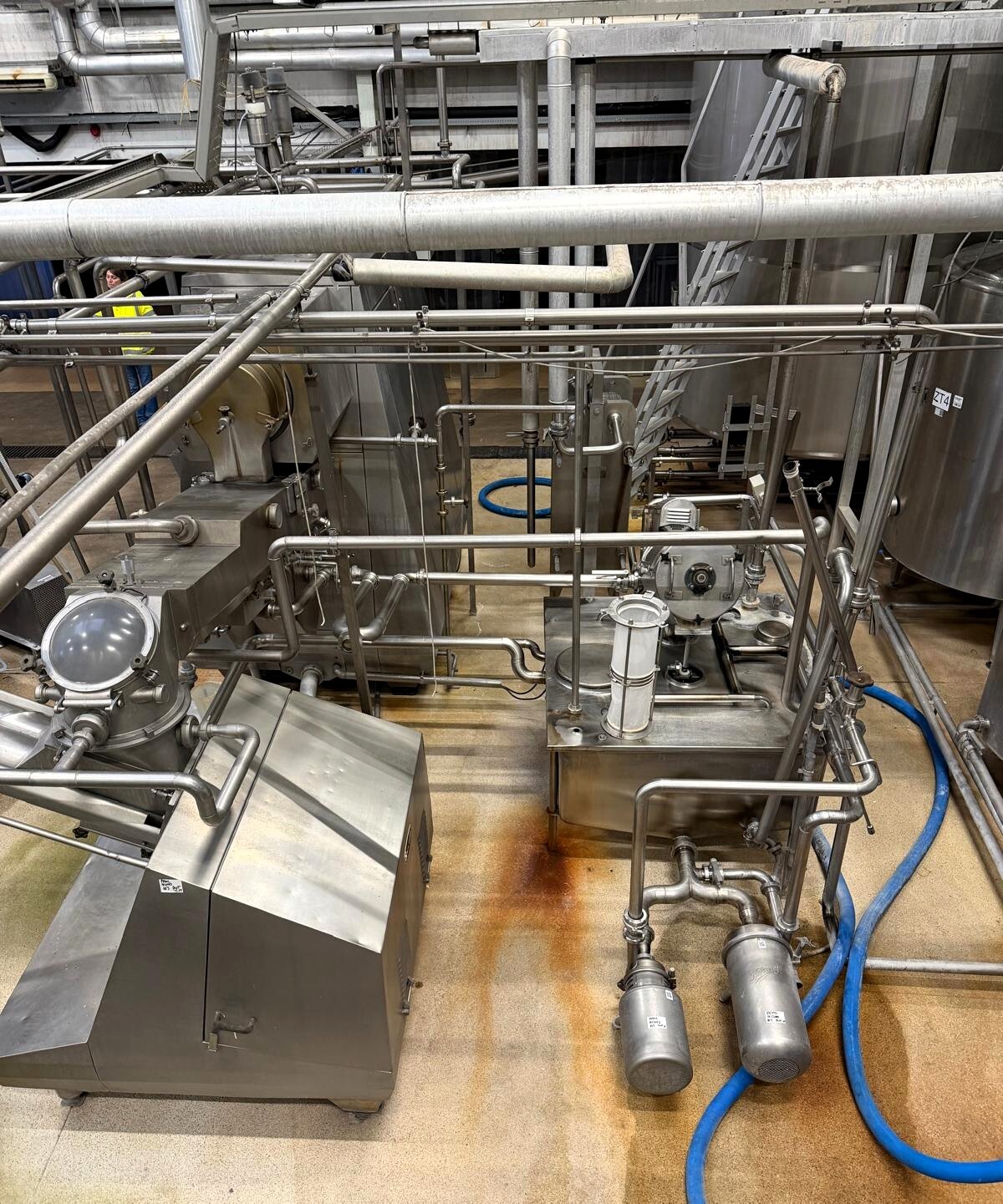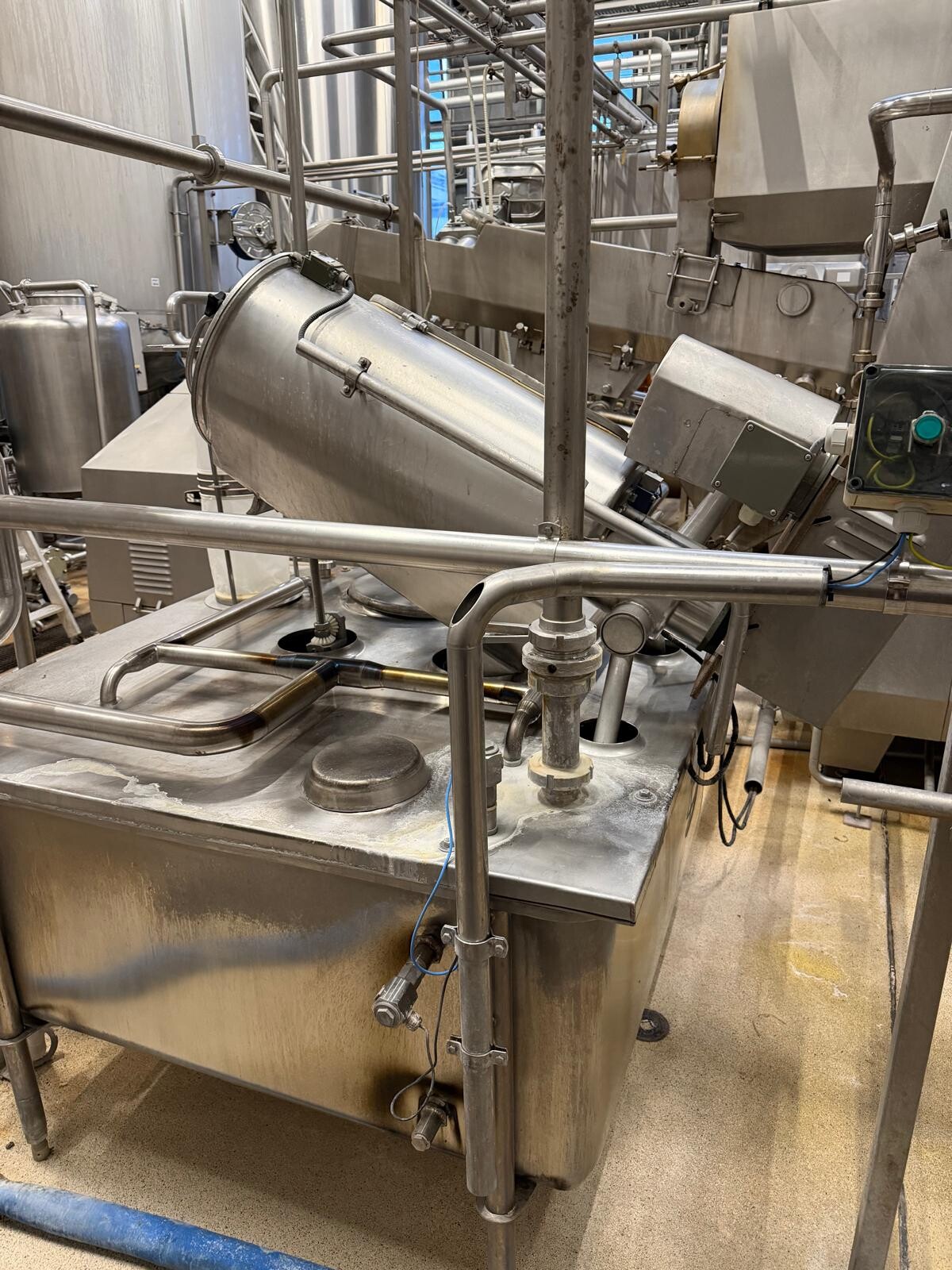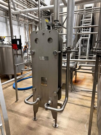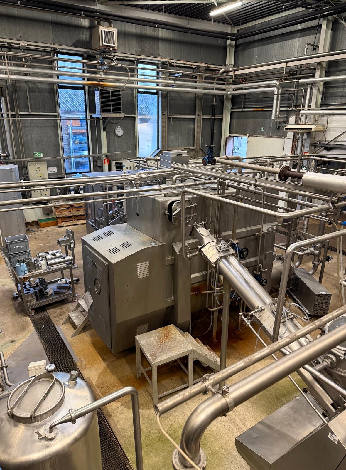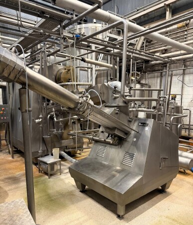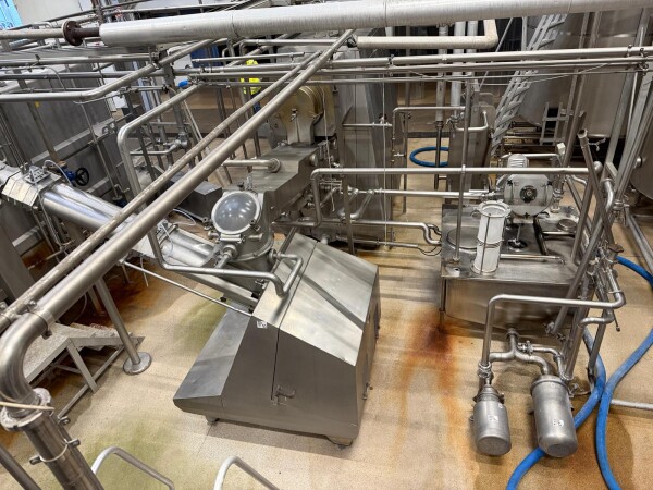 La baratte continue (CBM), fabriquée par Simon Frères, type MD1119 C (1983), a une capacité de production de beurre d’environ 2 000 kg par heure, sur la base d’un apport d’environ 4 000 litres de crème avec une teneur en matière grasse de 38 à 42 %. L’installation complète comprend une pompe d’alimentation en crème, un système de dosage d’eau et de culture, une section sous vide, un système de recirculation pour le refroidissement et l’injection de babeurre, des pompes d’injection de culture et de saumure, un refroidisseur de babeurre, des pompes à babeurre et CIP, un réservoir de collecte, des vannes, des tuyauteries et un système de contrôle complet. Après production, le beurre est pompé vers un silo à beurre Egli équipé de deux pompes de sortie Waukesha pour le transport vers les machines de remplissage.