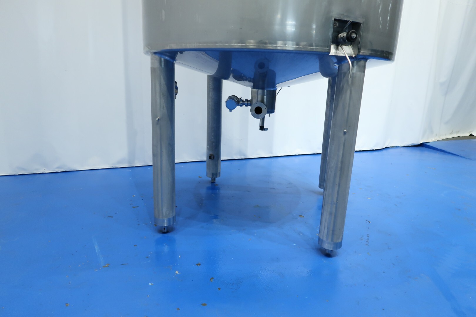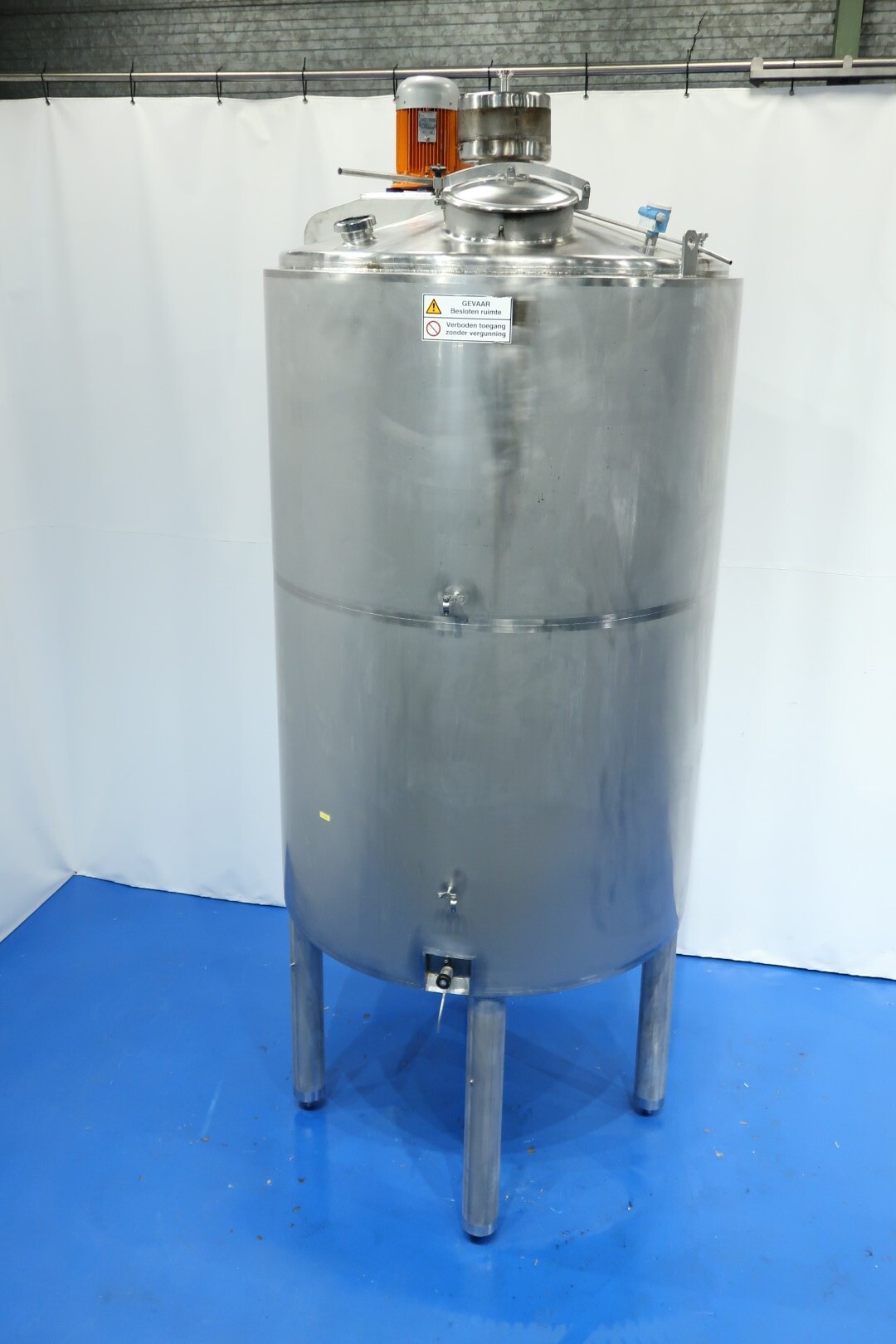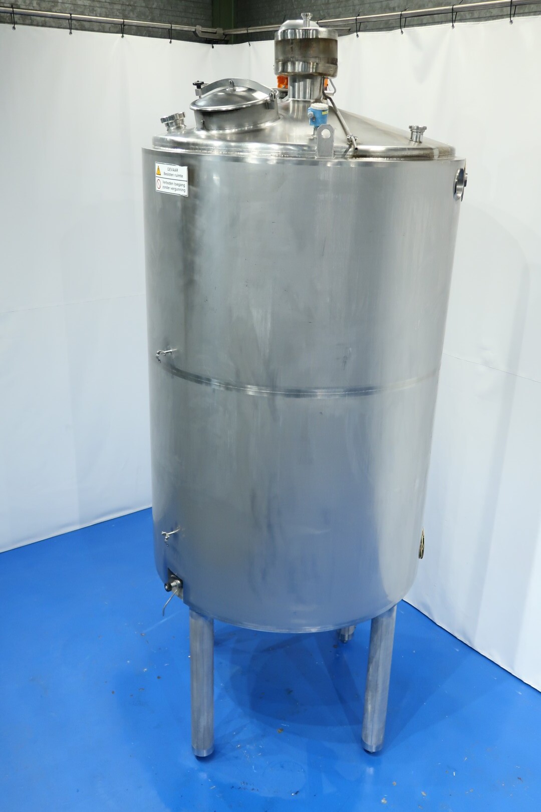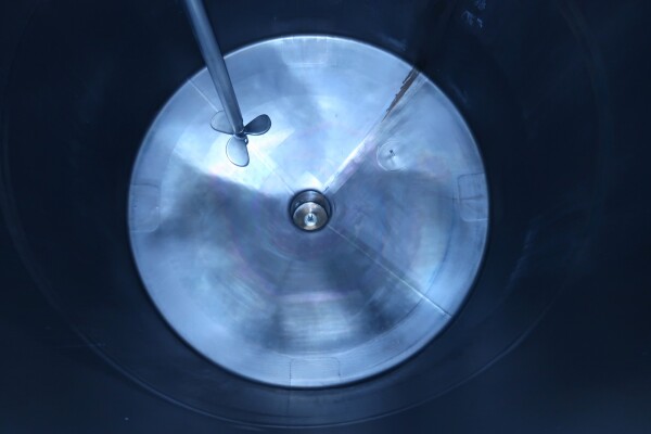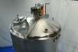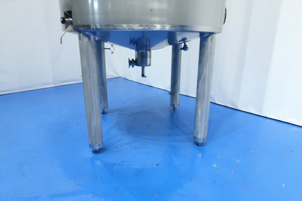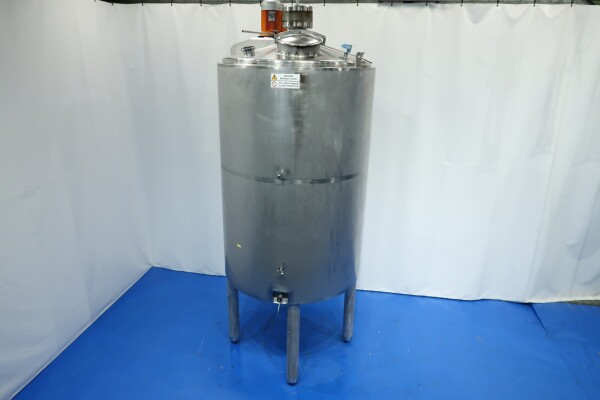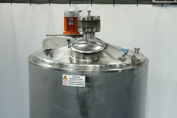 Double-walled, insulated vertical mixing tank. Formerly used for cooling and mixing cream. Driven by a Jongia JDR propeller stirrer: 0.9 kW - 3.5 A - 460 rpm. Insulated side and bottom walls. Pressure jacket: design 20 bar - test 10 bar - working pressure 3 bar. Pressure inside the tank: atmospheric. Operating tank temperature: 0-85°C, design temperature: 0-100°C. Operating jacket temperature: 0-85°C, design temperature: 0-150°C. Cooling surface: 15 m². Product outlet 2.5" DIN, outlet height: 95 cm. With cleanable sampling valve. Bottom: 1 temperature sensor, 1 level sensor, and 1 pressure sensor. Top: 1 level sensor, air vent, 1 CIP spray bowl, manhole on the top, round diameter 43 cm. 4 adjustable feet, internal dimensions: tank diameter 180 cm - cylindrical height 265 cm.