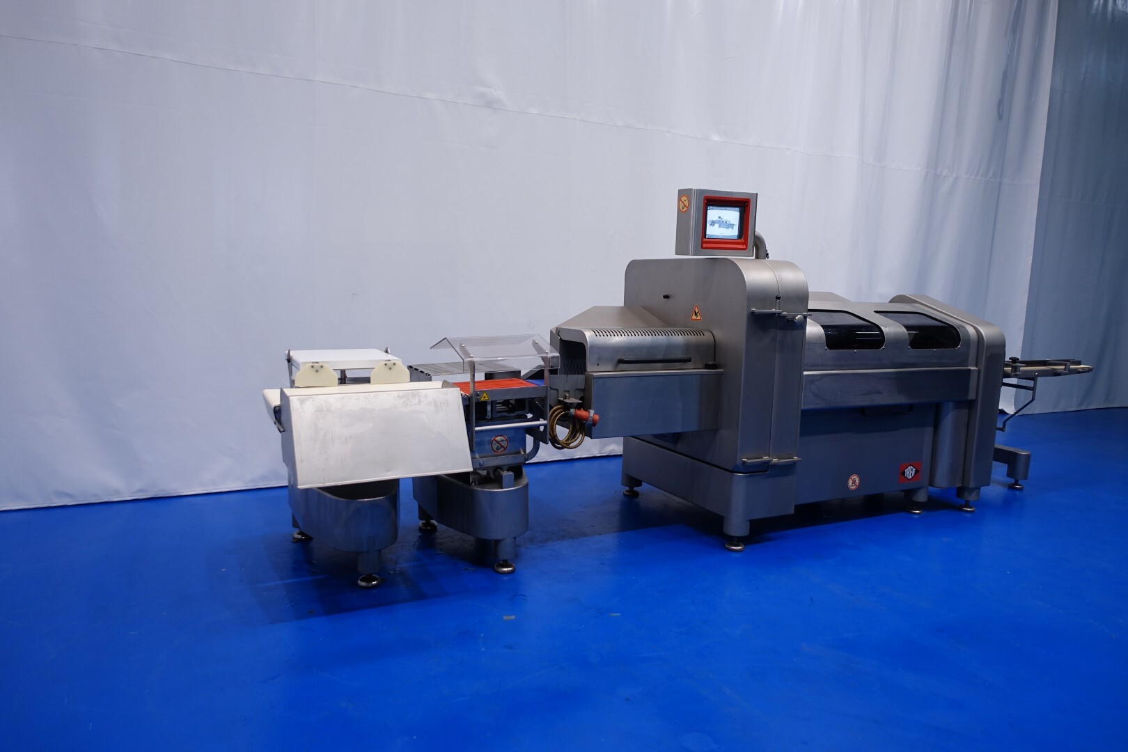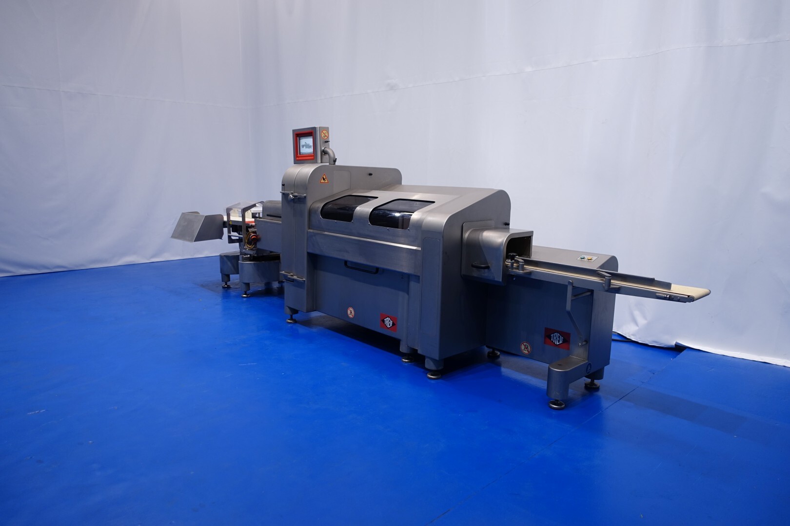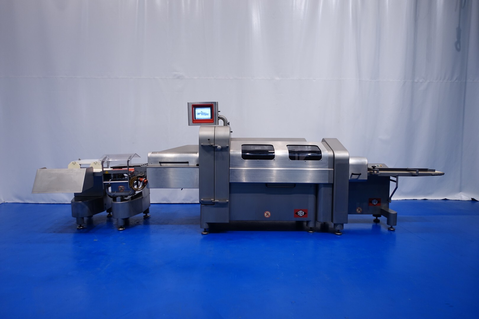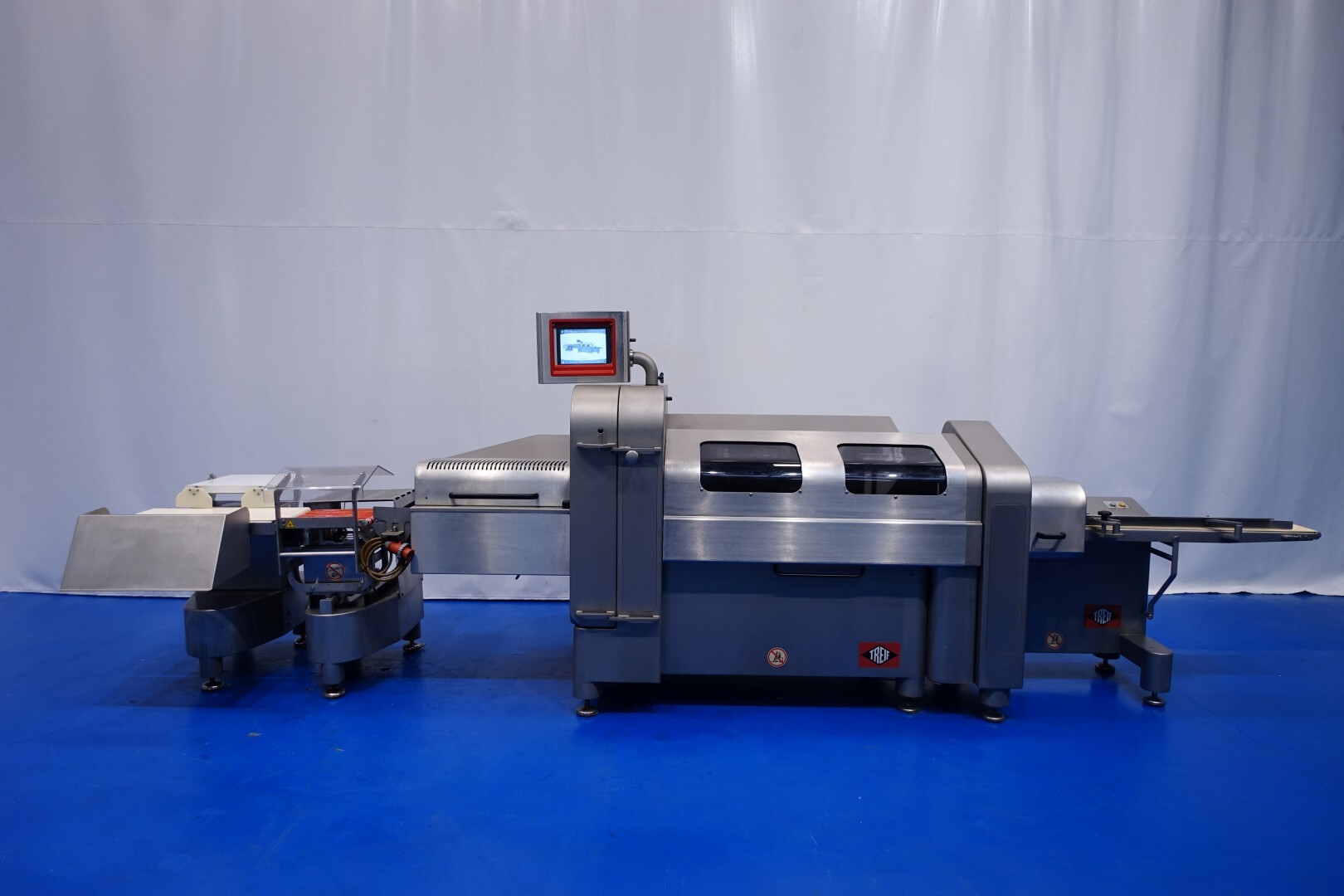 Machine de découpe / découpage en dés / découpe en portions / découpe de pain à grande vitesse par poids exact de fromage ou de viande, y compris une trieuse pondérale et une station de tri avec poussoir. La portion est scannée et la machine détermine automatiquement la longueur de la portion avec un rendement élevé. Sur la base de près de vingt ans d'expérience dans le domaine de la découpe de portions précisément pesées, TREIF a développé le coupe-portions FALCON. Ce Falcon est doté d'un affichage numérique avec écran tactile. Section d'insertion 260x155 mm / 220x155 mm, longueur simple max. 1000 mm, application jusqu'à -4 °C.