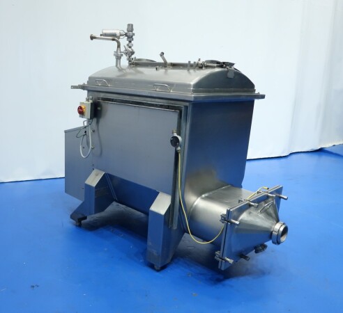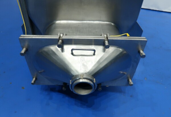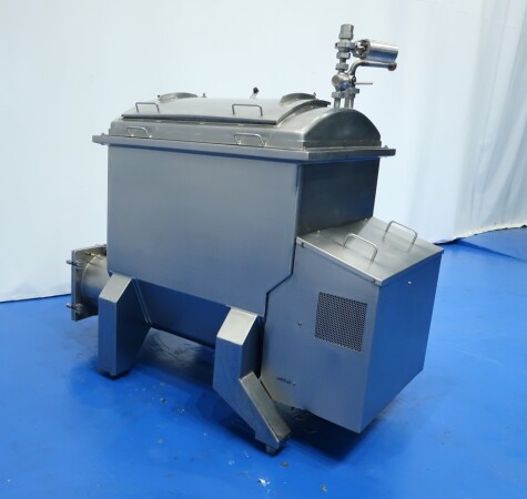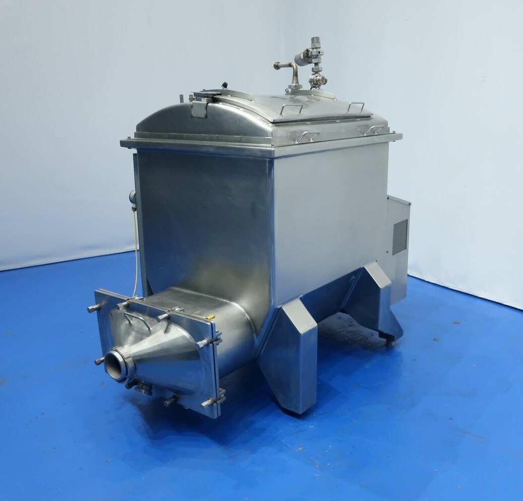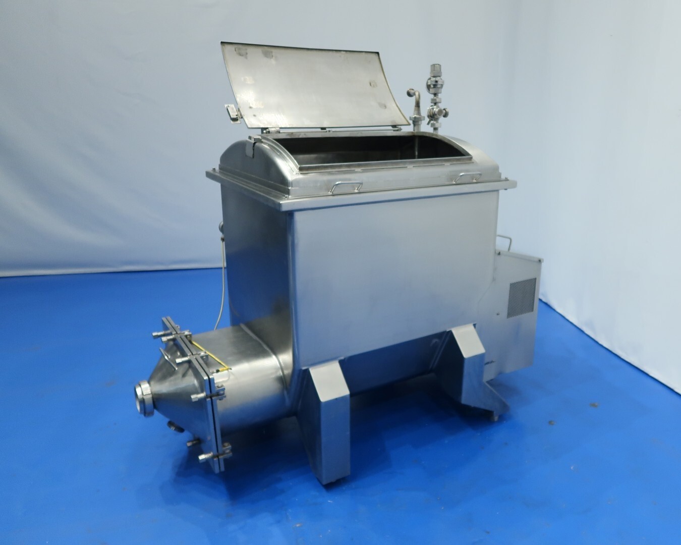 Ce silo fermé pour beurre est équipé de deux vis entraînées par un seul moteur de 2,2 kW et d’un couvercle supérieur (80 × 44 cm) muni d’un capteur de sécurité. L’intérieur bénéficie d’une finition antiadhésive spéciale pour éviter que le beurre n’adhère. L’unité est entièrement nettoyable par CIP et possède une sortie DN100 pour le beurre ainsi qu’un raccord CIP de 2,5". L’appareil fonctionne manuellement via un interrupteur marche/arrêt avec capteurs de sécurité intégrés. Le silo mesure 186 × 100 × 168 cm et pèse 480 kg.