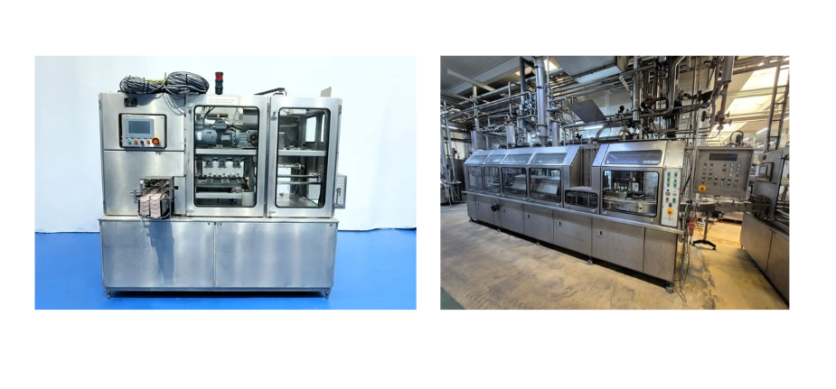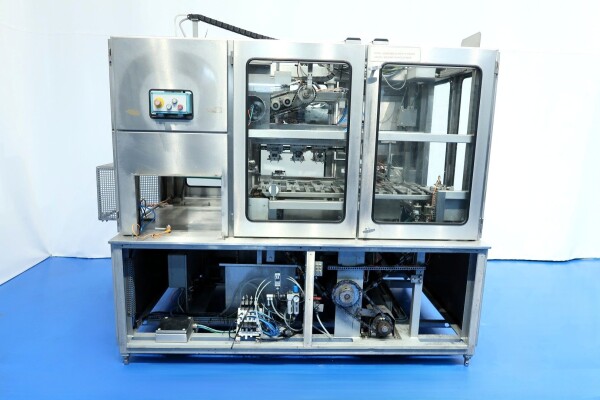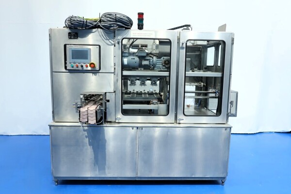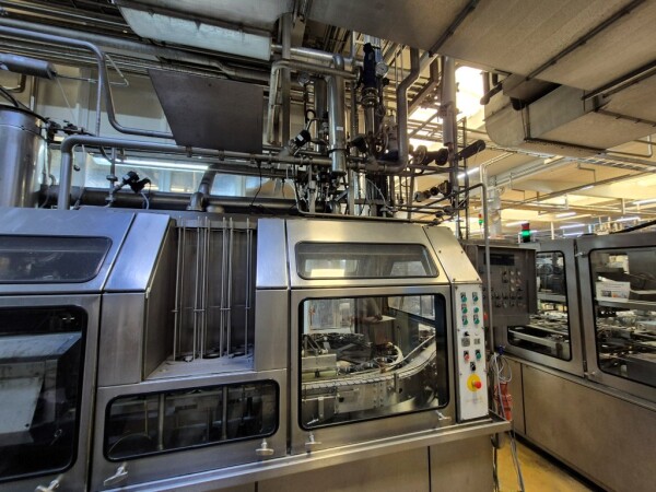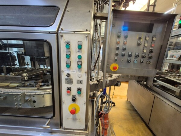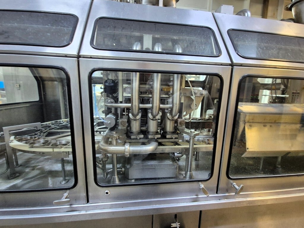 Ampack KF1/3: De carousel cupvul- en sealmachine is ontworpen voor ronde voorgevormde cups met een diameter van 95 mm. De capaciteit is afhankelijk van de viscositeit en schuimeigenschappen van het product, evenals van de vorm en de vulhoogte van de verpakking. De machine beschikt over vacuüm cupontstapeling, cupdesinfectie door peroxide-injectie met droging via oververhitte stoom in vier stappen met geïntegreerde elektrische luchtverhitter, een predoser met snijdoser voor viskeuze producten zoals fruitjam (CIP-reinigbaar door een reinigingsstaaf te plaatsen) en een hoofdpositief doser/combifiller geschikt voor zowel dunne als dikke producten, eveneens CIP-reinigbaar. Extra stations omvatten sealdesinfectie met infraroodstralers en sealing, heat sealing, sealcontrole door cupdruk en detectie, een over snap cap-dekeldrukstation voor 95 mm cups en uitloop naar een transportband. De machine wordt bestuurd via Siemens Simatic S5 en is oorspronkelijk geleverd als ASGP4.