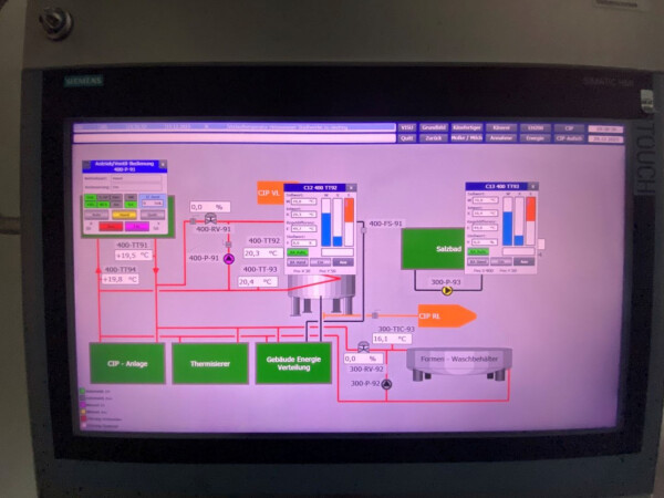 CIP-systeem met 3 tanks van 1200 ltr elk. Merk: Schwarte Milfor. Pompen, kleppen, warmtewisselaar, handmatige doseerpompen voor chemicaliën (vaten).