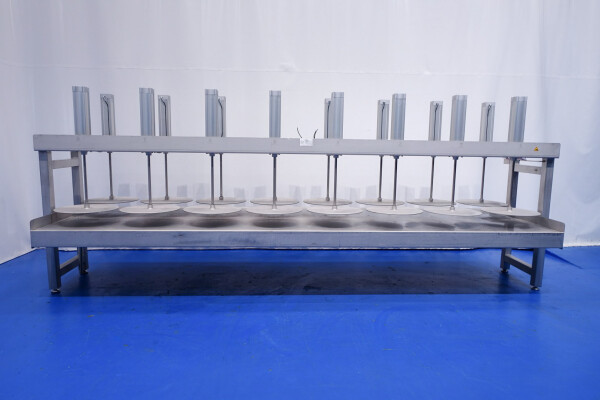 Eindpersen. Merk: ASTA Eismann. Pneumatisch met tafel en 2x6 cilinders, mobiel. Onder elke cilinder hoogte 1200 mm. 5 kazen x 4 = 20 kazen van 10/12 kg. 6 kazen x 6 = 4/5 kg.