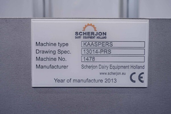 Tweede pers. Merk: Scherjon. Kaaspers met 16 cilinders, geschikt voor middelgrote en grote kazen. Frame volledig van roestvrij staal met Festo aluminium cilinders. Staat: uitstekend en werkend (video beschikbaar).