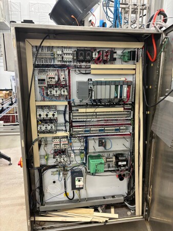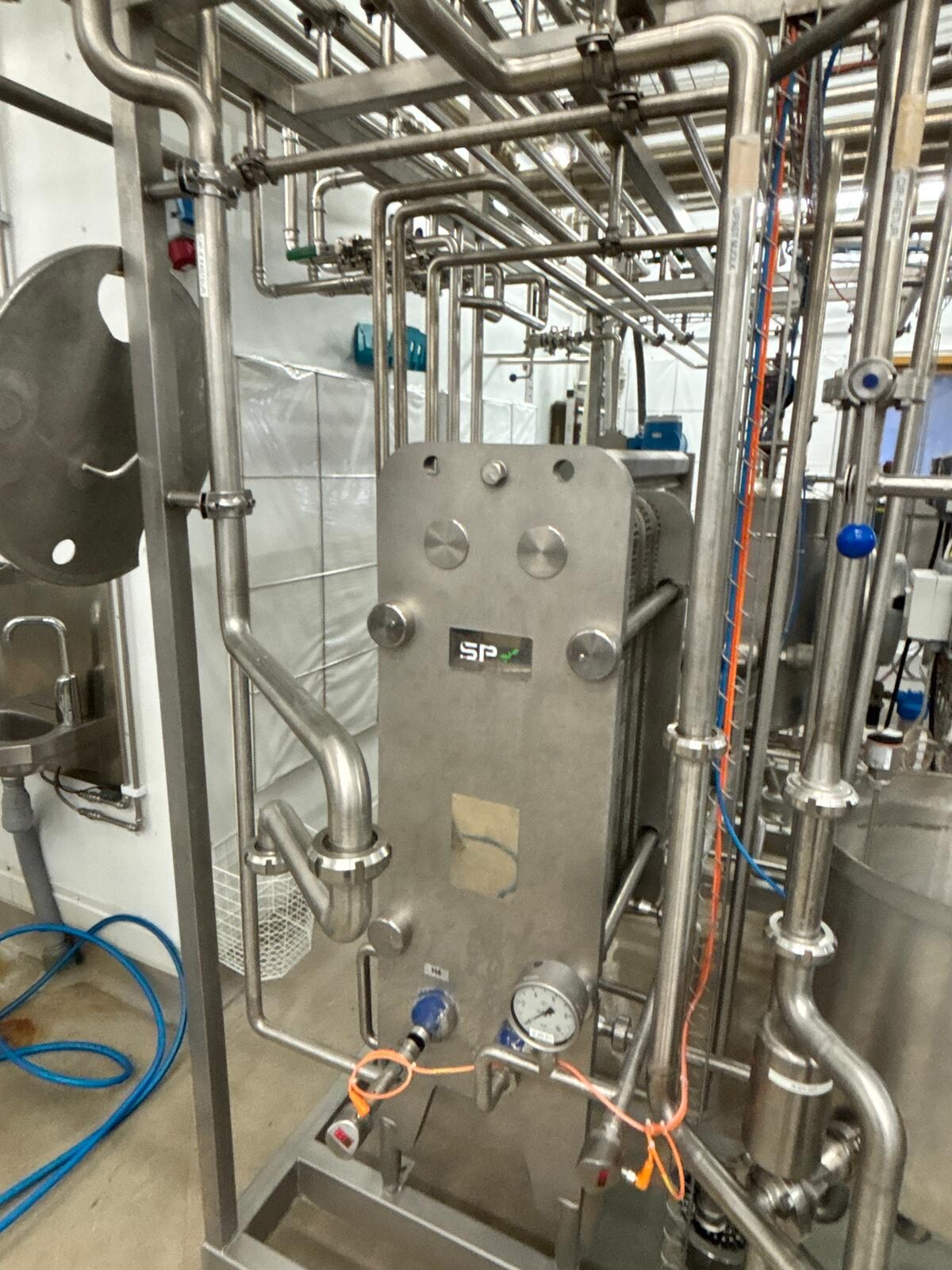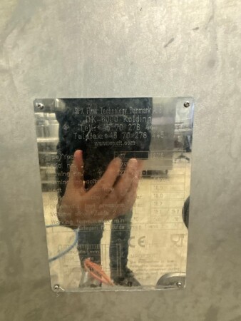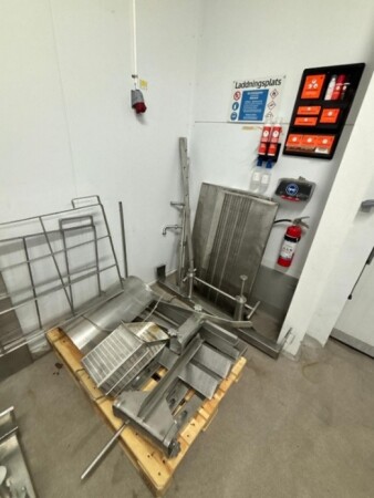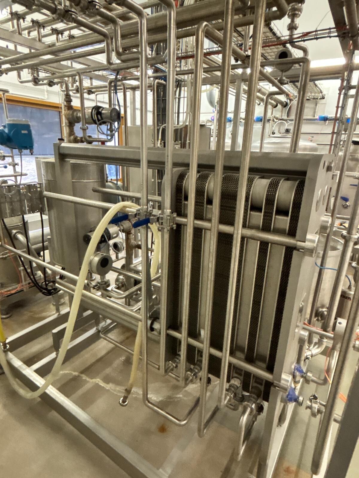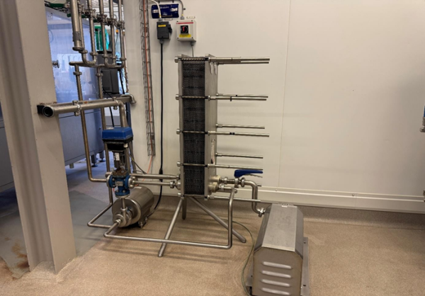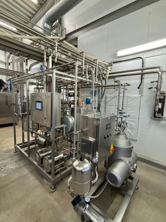 Balance tank stainless steel, equipped with level control using level pins. Centrifugal pump stainless steel with hygienic design. Flow transmitter, capacity indication in litres per hour (L/h). Plate heat exchanger Make: SPXP Model H17 Year 2015. Holding tube for accurate pasteurisation holding time. Control panel, including: Main switch, PLC controller: Siemens S7, Operator panel with colour touch screen. Heating system: Hot water heating medium, including buffer tank and hot water circulation pump. Flow diversion valve pneumatically operated; diverts product automatically if pasteurisation temperature drops below the set point.Temperature sensors PT‑100 sensors installed at product inlet, highest temperature point, and outlet. The complete unit is pre-assembled on a stainless-steel frame, including all interconnecting piping, fittings, valves, and cabling.