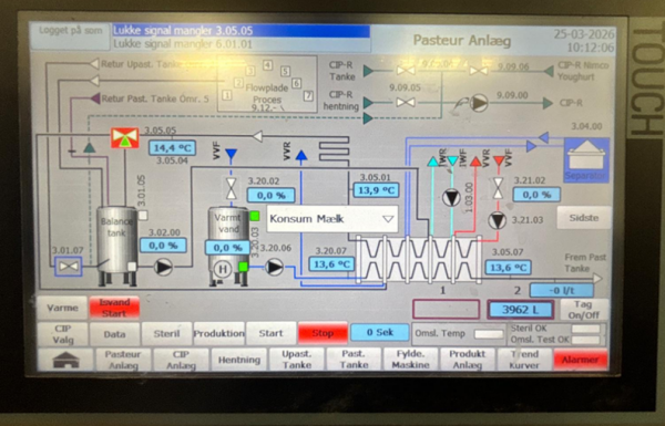 Complete semi-automatic milk pasteurizer with a processing capacity of 1,350 litres per hour (input). The system operates through sequential phases including start-up, sterilisation, production, shutdown, and cleaning.