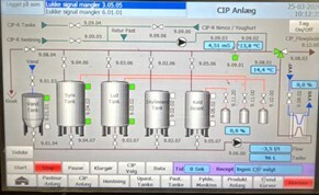5 cleaning tanks:  Lye tank: 1,000 litres, Acid tank: 1,000 litres, Pre rinse tank : 500 litres, Water tank Disinfection tank. Integrated pre rinse recuperated water, circulation pump,filter, heat exchanger, temperature and conductivity transmitters, pneumatic valves with position sensors, complete CIP piping and chemical dosing pumps.
