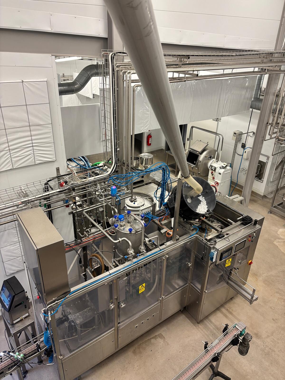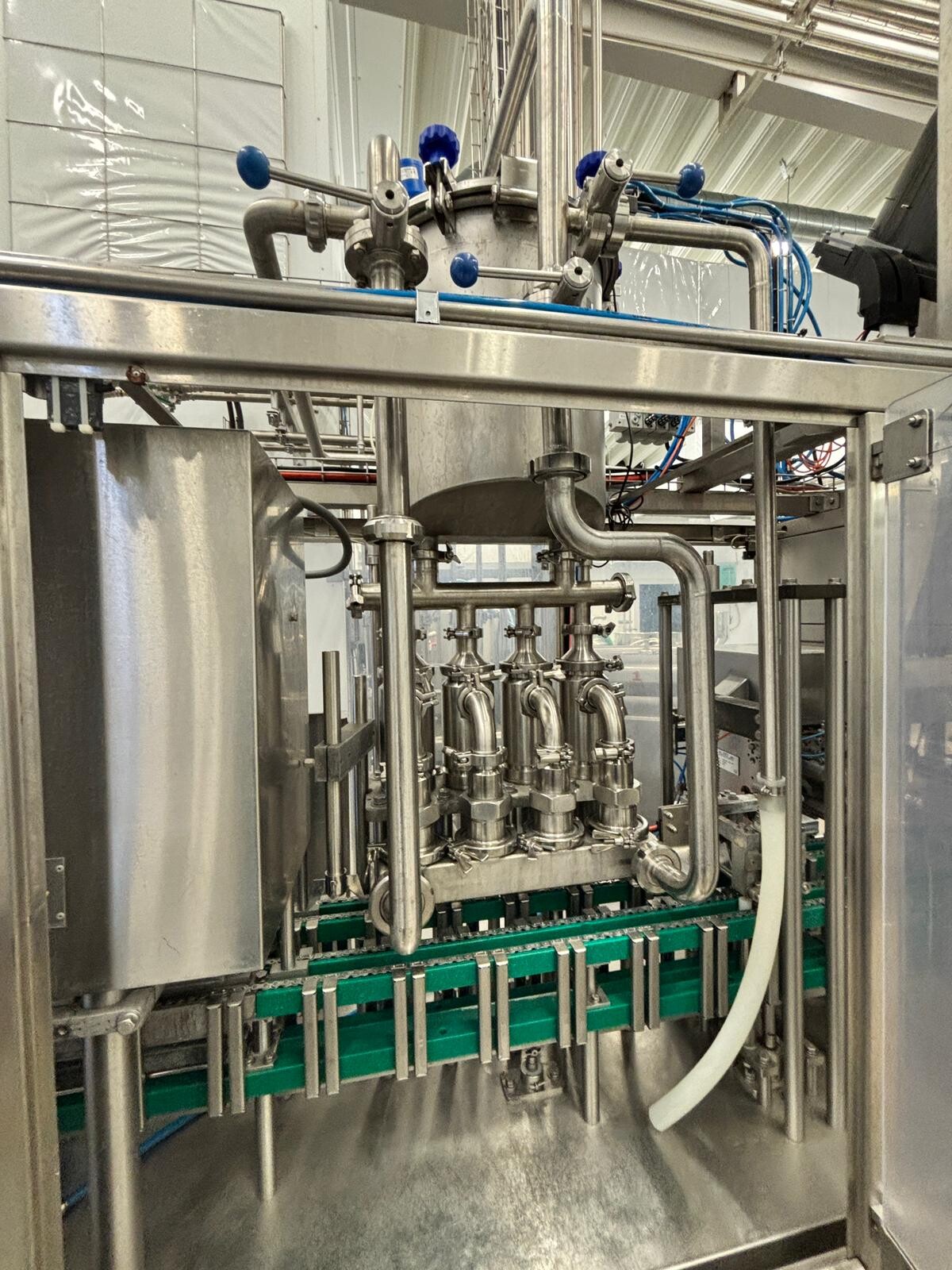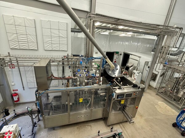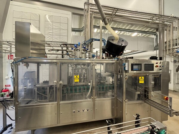 Machine configuration: Electrically heated, 4‑head piston filler, product hopper, filling valves, PLC control system (A + B), outfeed conveyor, inkjet date coder, cap applicator (mid‑cap suitable for yoghurt, viscous products, and milk) and cap feeder.