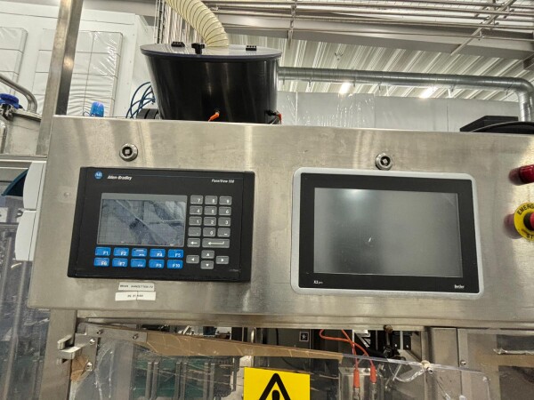 Bag‑in‑box filling unit with flow transmitter and integrated control system for pre‑formed bags with spout, suitable for 10–20 litre bags for hygienic filling applications.