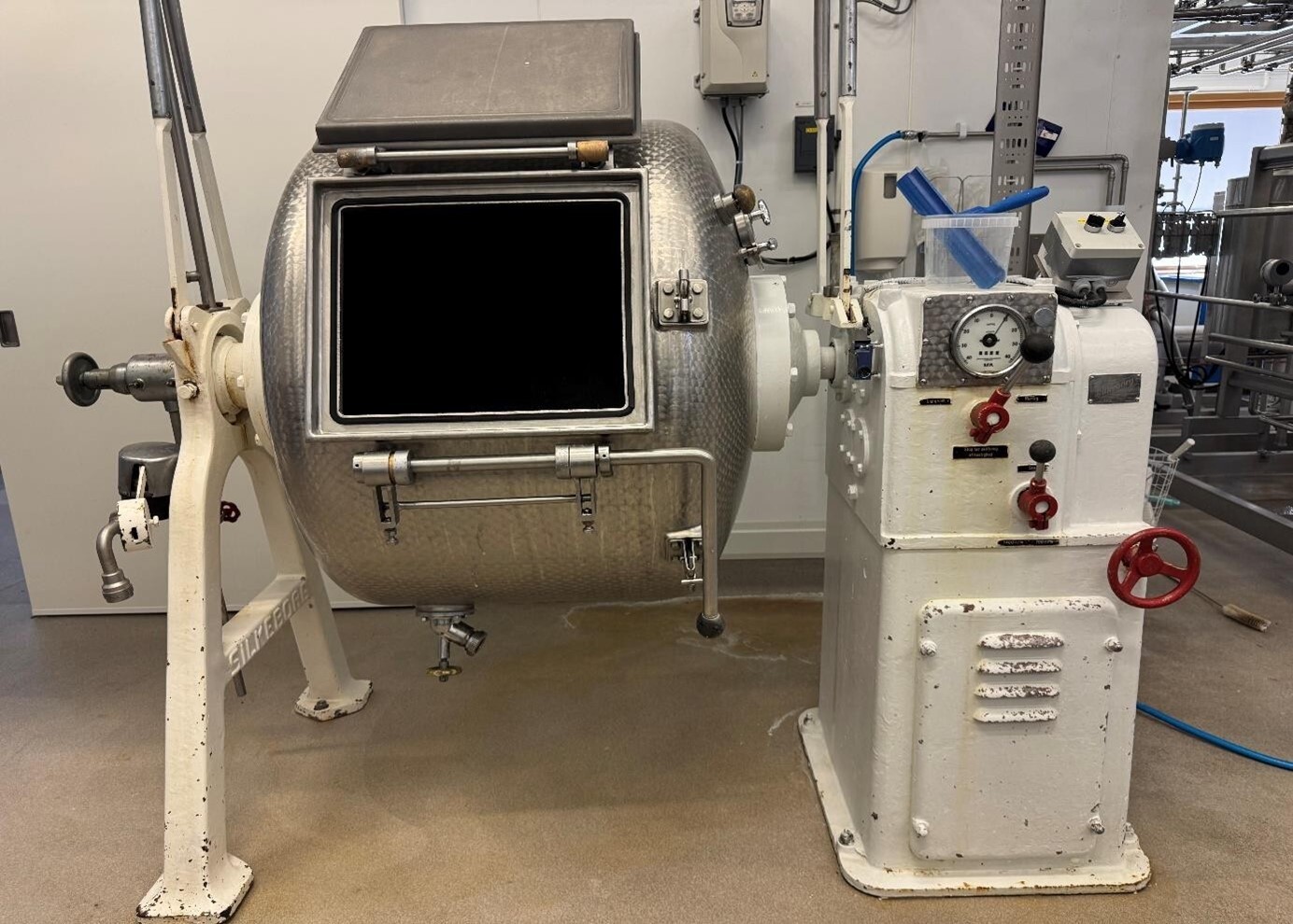 Silkeborg Butter Churn 500 litres, producing approximately 125 kg of butter per batch. The butter churn is complete and equipped with: heavy‑duty, robust drive system,  large hatch for easy opening and cleaning, breather valves and safety protection bar.