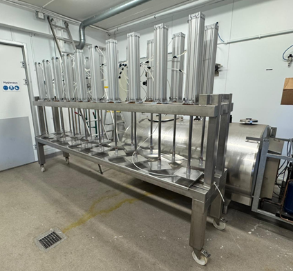 Cheese press 2: Mobile table press with 20 pressing cylinders, complete stainless steel construction and suitable for semi‑hard cheese production.