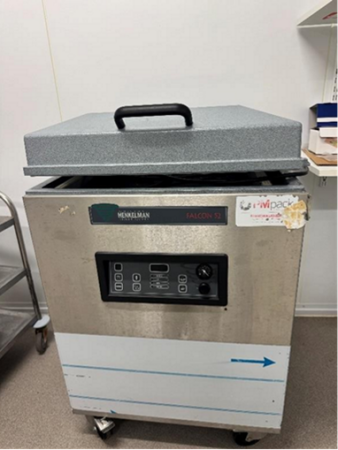 Vacuum packaging machine for pre‑formed bags, suitable for vacuumising and sealing products.