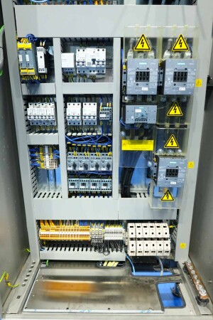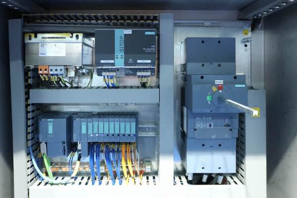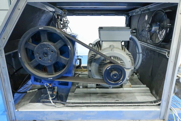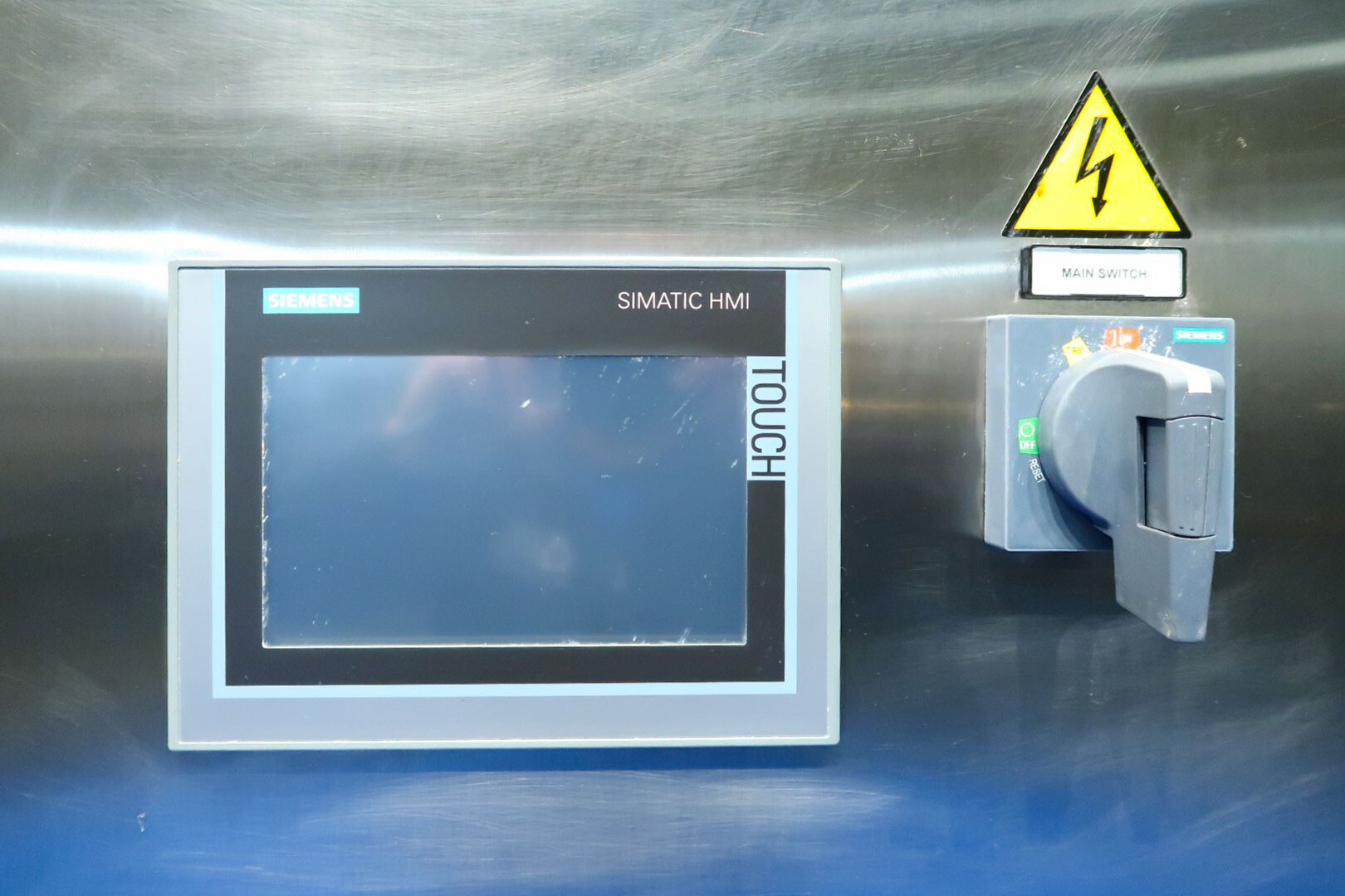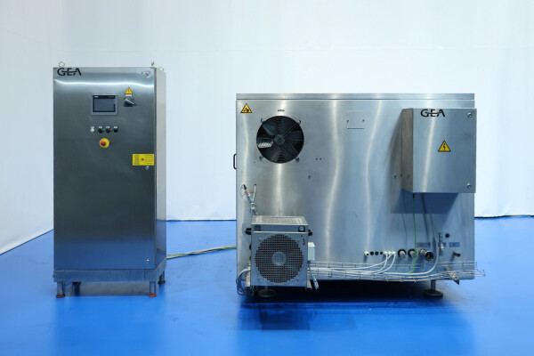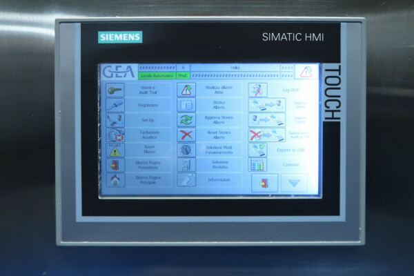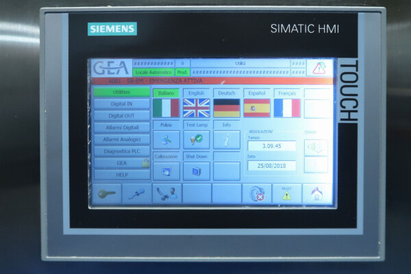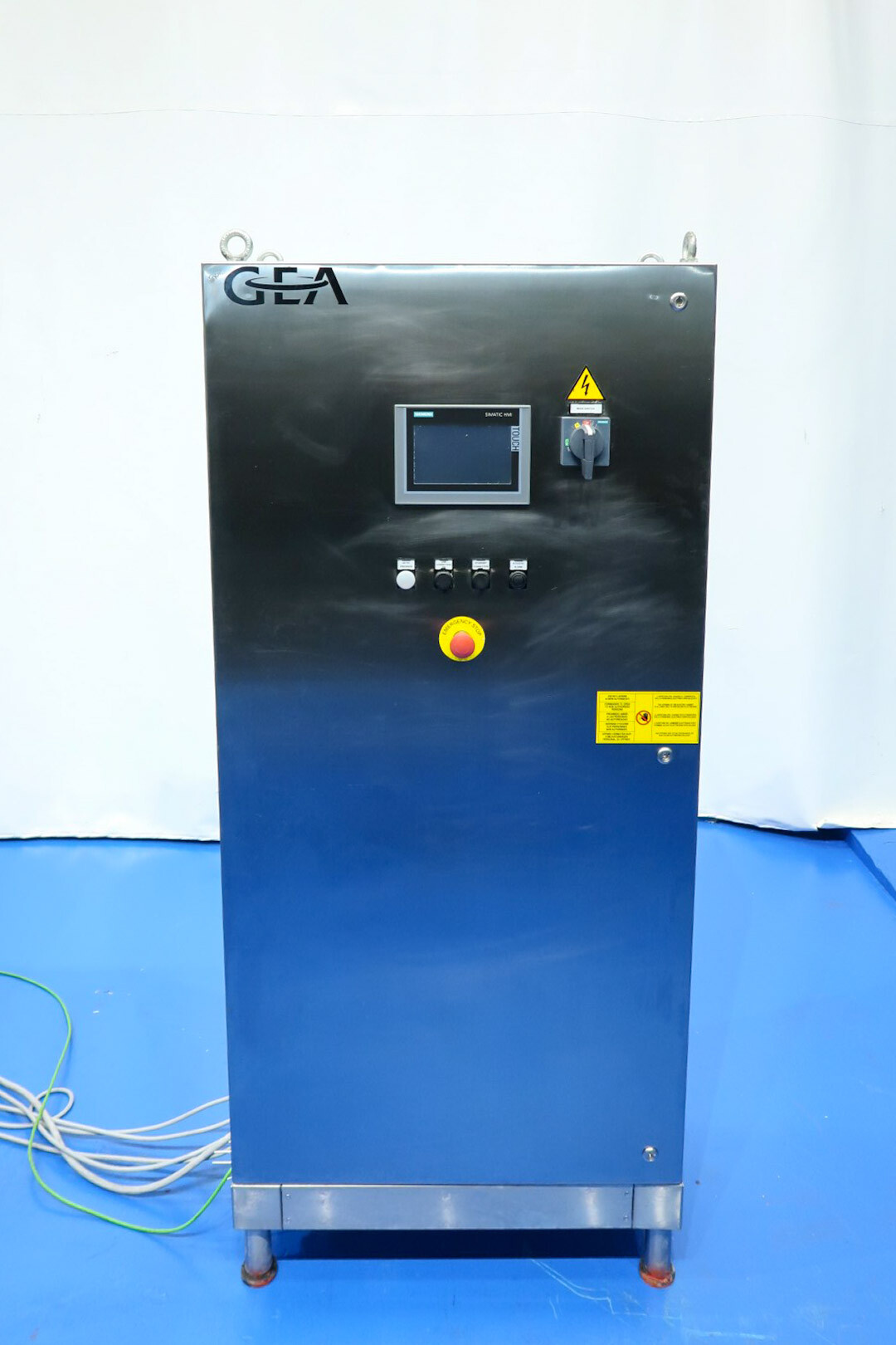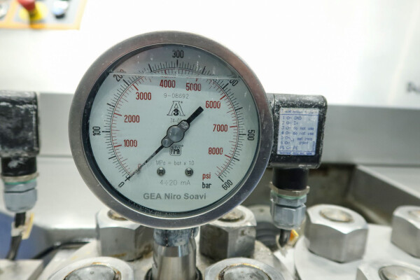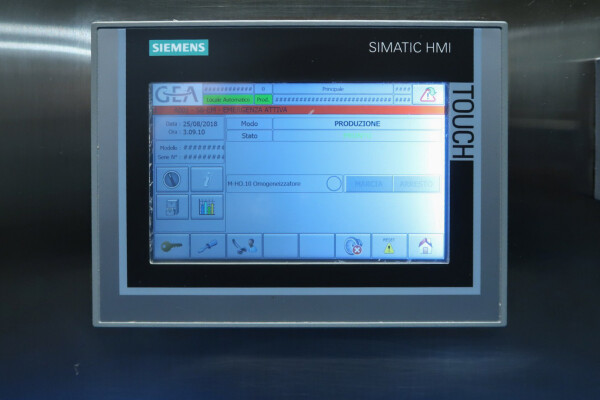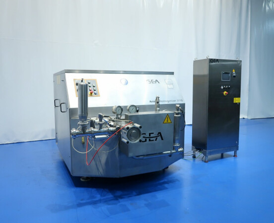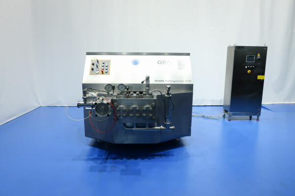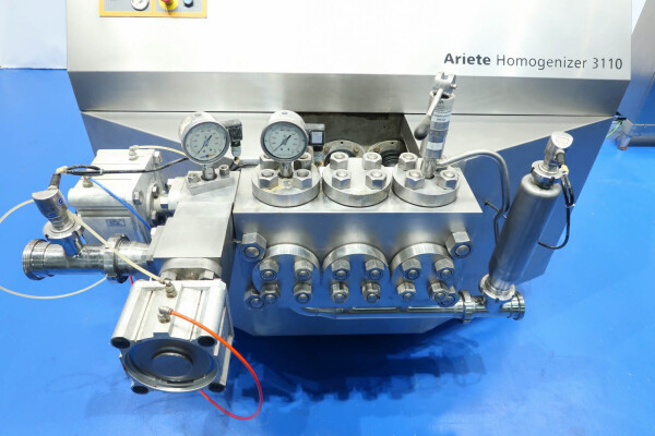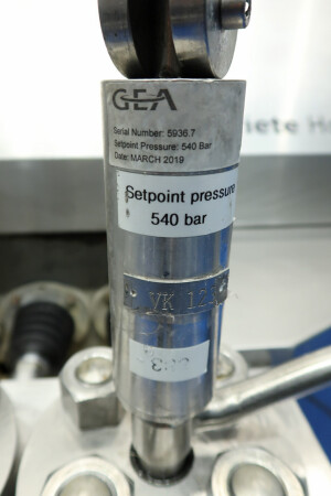 Hogedrukhomogenisator. 2 trappen met pneumatische drukregeling. 3 keramische zuigers, zuigerdiameter: 55 mm en slag: 100 mm. Roestvrij staal bekleed met geluiddempend materiaal. Aansluitingen: 2 x 3" Din. Huidig motorvermogen: 132 kW en maximale druk in stroomconfiguratie met deze motor 450 bar. Vrijstaand bedieningspaneel met Siemens Simatic ET 200SP-besturing. Kleine schakelkast op machine met Siemens Simatic ET 200SP-besturing. Met overdrukventiel (ingesteld op 540 bar). Manometer op 1e en 2e trap. Elektronische druktransmitter op in- en uitlaat. Stromingsschakelaar op koelwater. Pulsatiedemper op inlaat. Drukregeling op afstand. Met reserve-pulsatiedemper en overdrukventiel. Documentatie: gebruiksaanwijzing, elektrisch schema, Onderdelenlijst en servicerapport. Afmetingen bedieningspaneel: 80x40x187 (lxbxh) cm.