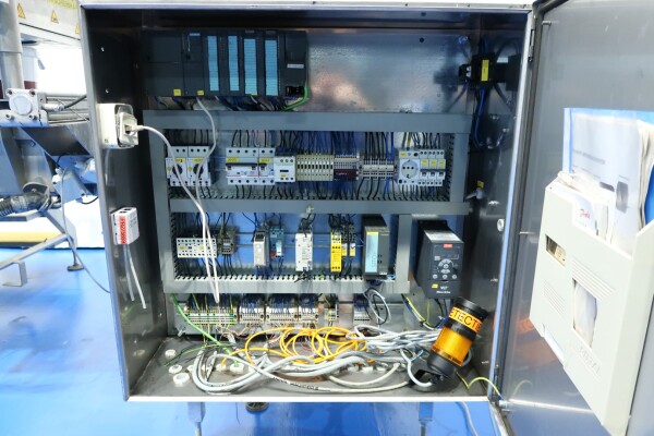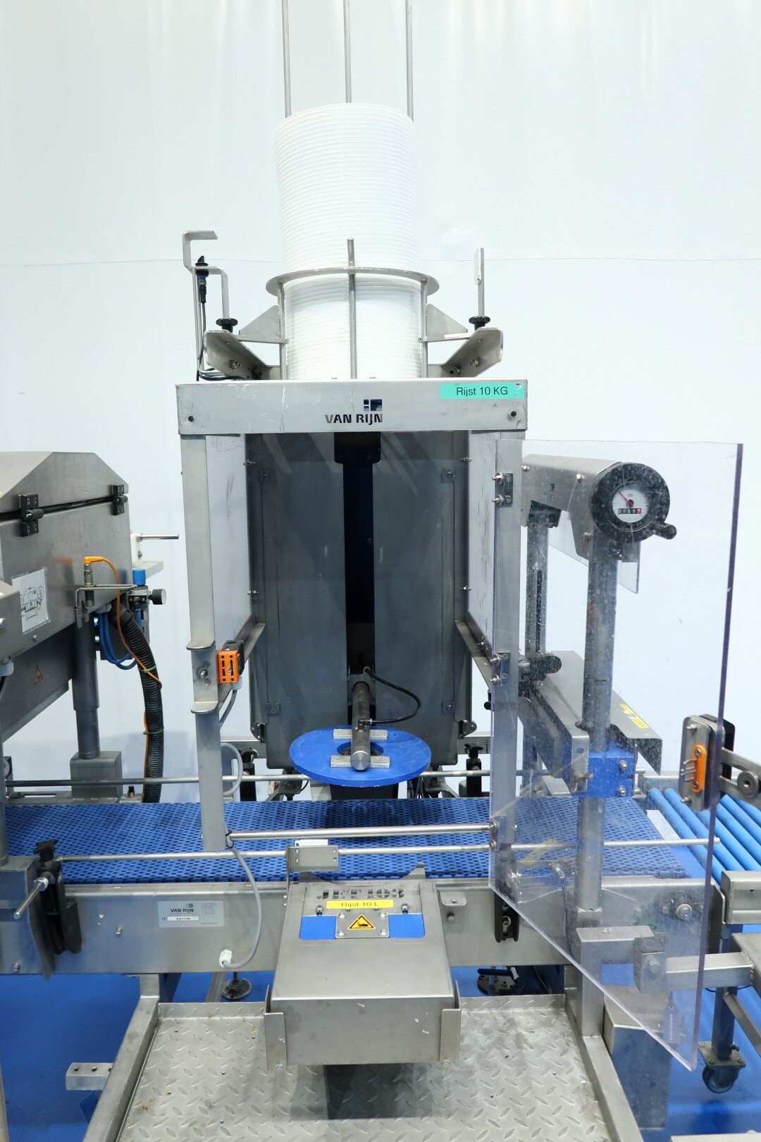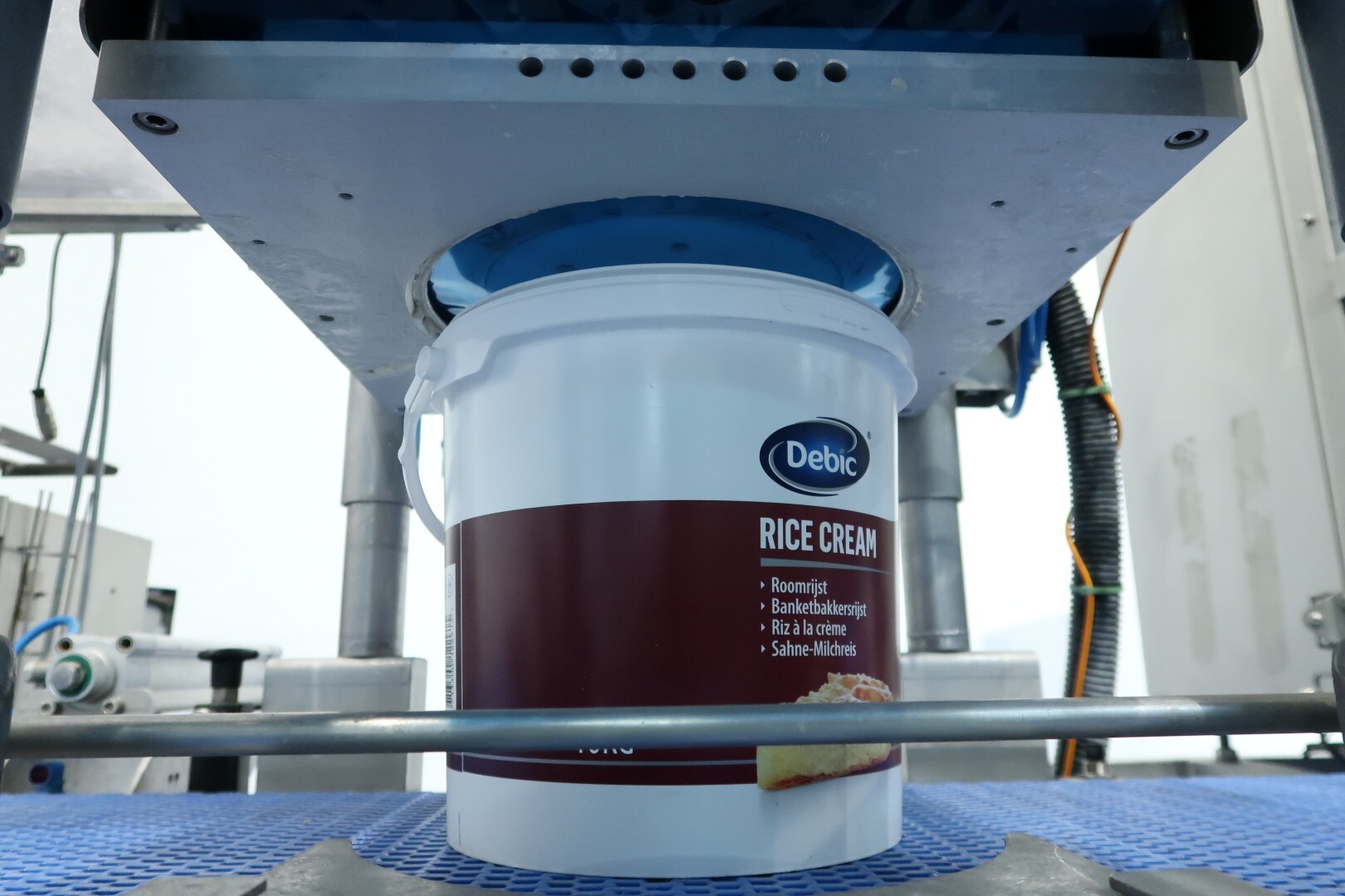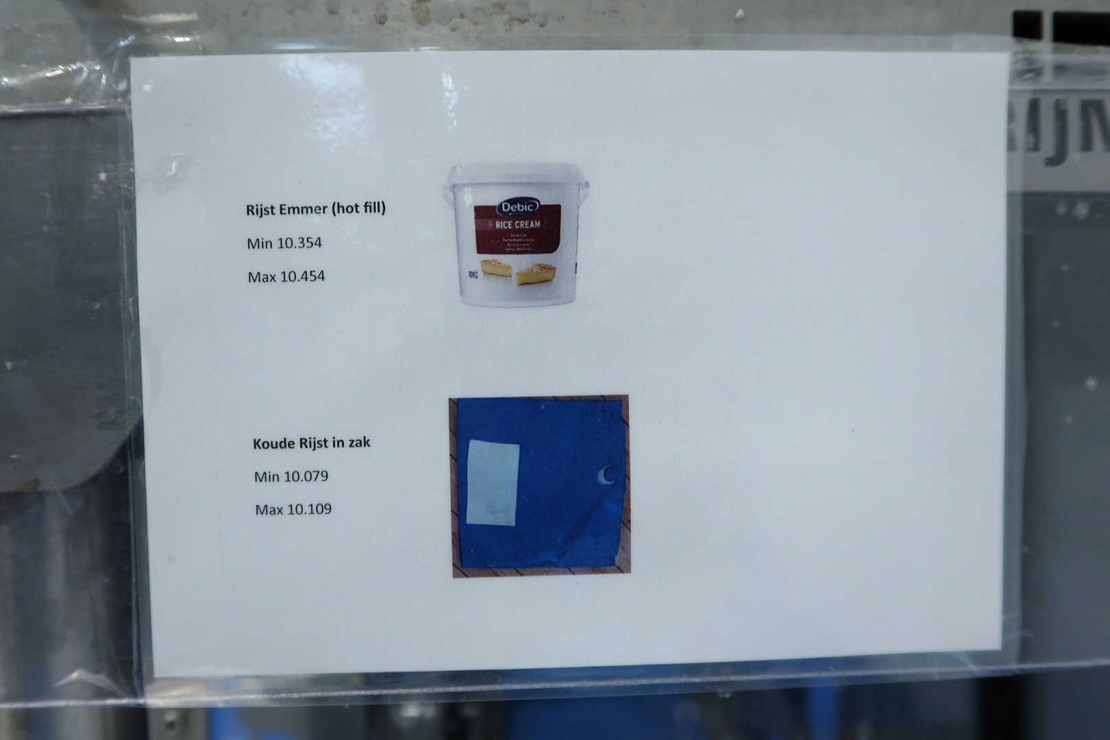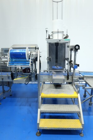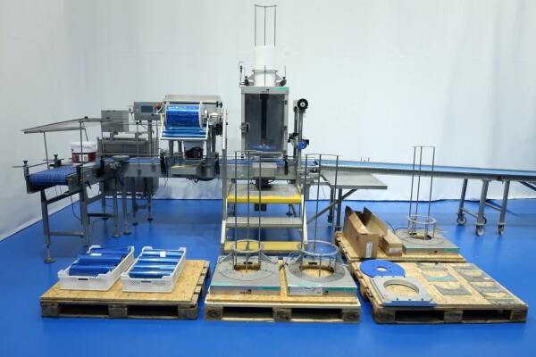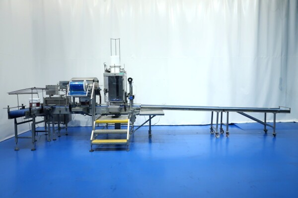 De machine voor het sluiten van emmers en deksels verwerkt formaten van 5 kg, 10 kg en 15 kg. De emmer van 10 kg heeft een binnendiameter van 25 cm. De machine is uitgerust met een extra sealplaat en sealdetectie, evenals een invoer- en een mobiele uitvoerband. (420 cm lang en 40 cm breed). De emmers worden onder een hoek van 90° op de centrale transportband aangevoerd, naar de sealer getransporteerd, waar de bovenkant wordt geseald met behulp van een stopcilinder voor de emmertoevoer, en vervolgens naar het dekselplaatsstation worden verplaatst. Het deksel wordt gepositioneerd door een duwer voordat de emmers worden overgebracht naar de uitvoerbufferband. De foliesealer, dekselplaatser en duwstations zijn allemaal uitgerust met positioneringssledes. De machine wordt aangestuurd door een Siemens Simatic S7-300 PLC met een op de machine gemonteerd HMI-scherm. Documentatie is beschikbaar in het Nederlands. |