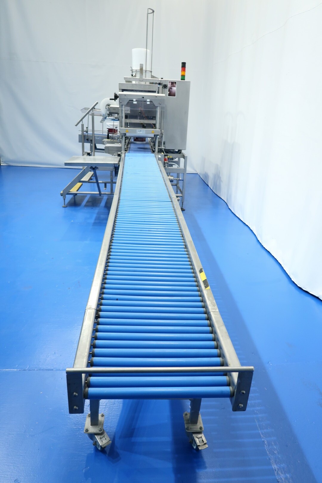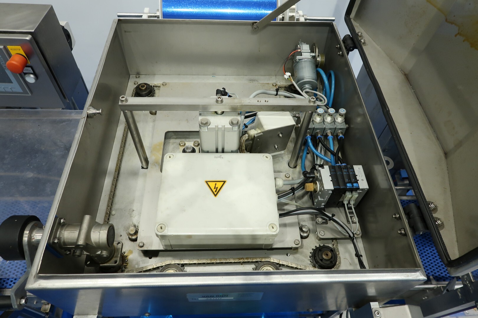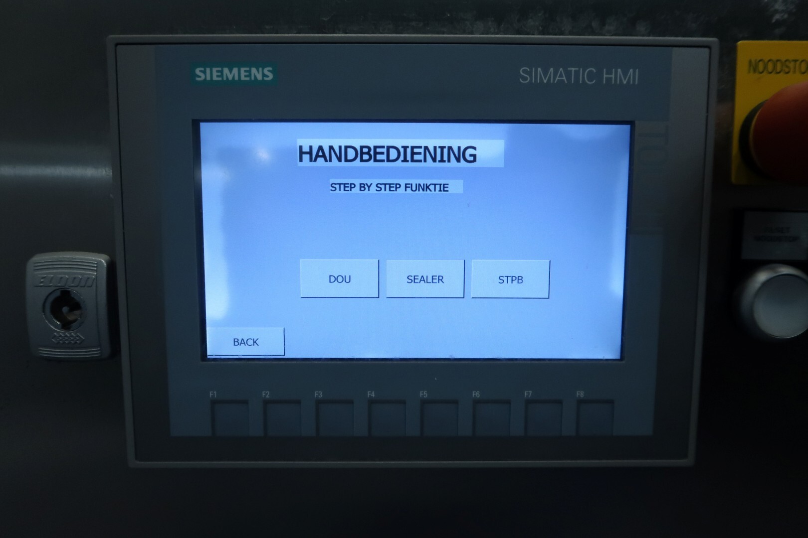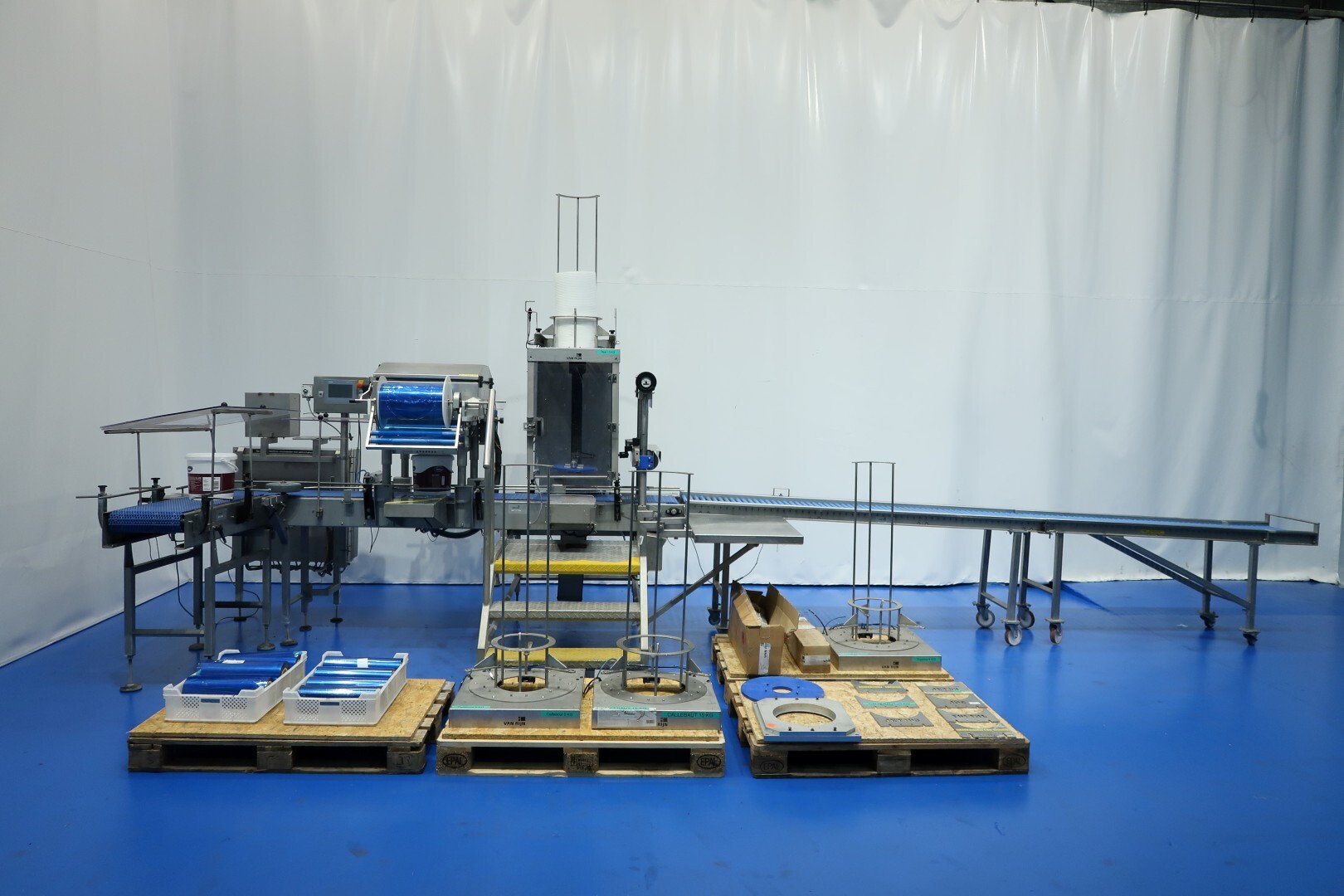 De machine voor het sluiten van emmers en deksels verwerkt formaten van 5 kg, 10 kg en 15 kg. De emmer van 10 kg heeft een binnendiameter van 25 cm. De machine is uitgerust met een extra sealplaat en sealdetectie, evenals een invoer- en een mobiele uitvoerband. (420 cm lang en 40 cm breed). De emmers worden onder een hoek van 90° op de centrale transportband aangevoerd, naar de sealer getransporteerd, waar de bovenkant wordt geseald met behulp van een stopcilinder voor de emmertoevoer, en vervolgens naar het dekselplaatsstation worden verplaatst. Het deksel wordt gepositioneerd door een duwer voordat de emmers worden overgebracht naar de uitvoerbufferband. De foliesealer, dekselplaatser en duwstations zijn allemaal uitgerust met positioneringssledes. De machine wordt aangestuurd door een Siemens Simatic S7-300 PLC met een op de machine gemonteerd HMI-scherm. Documentatie is beschikbaar in het Nederlands. |