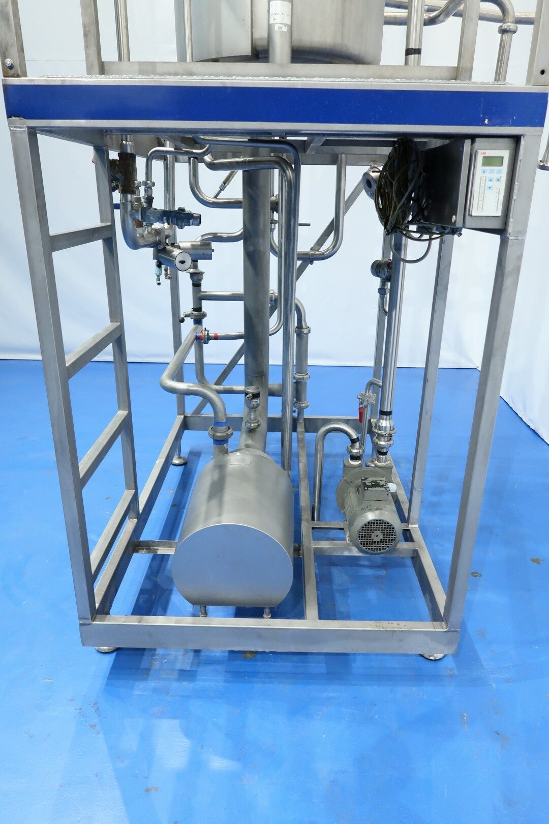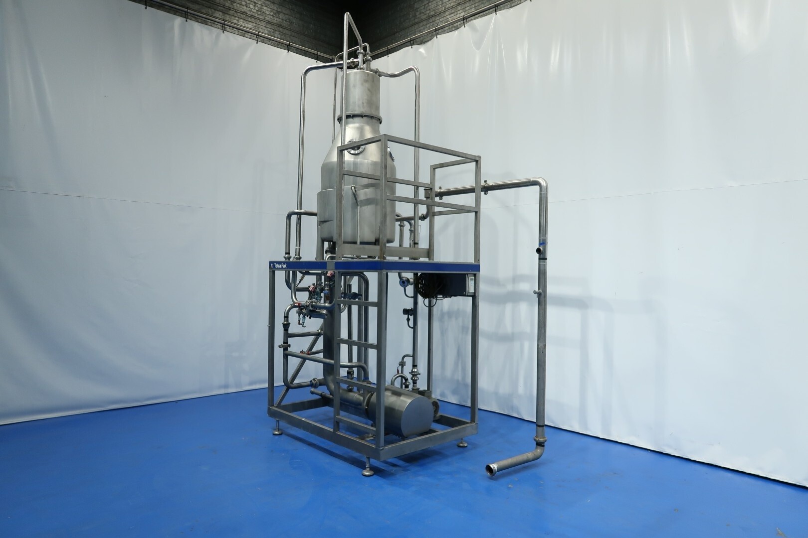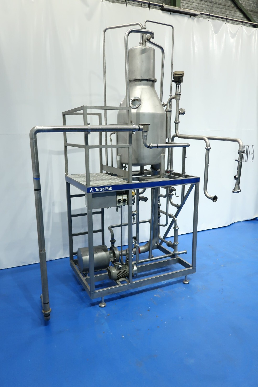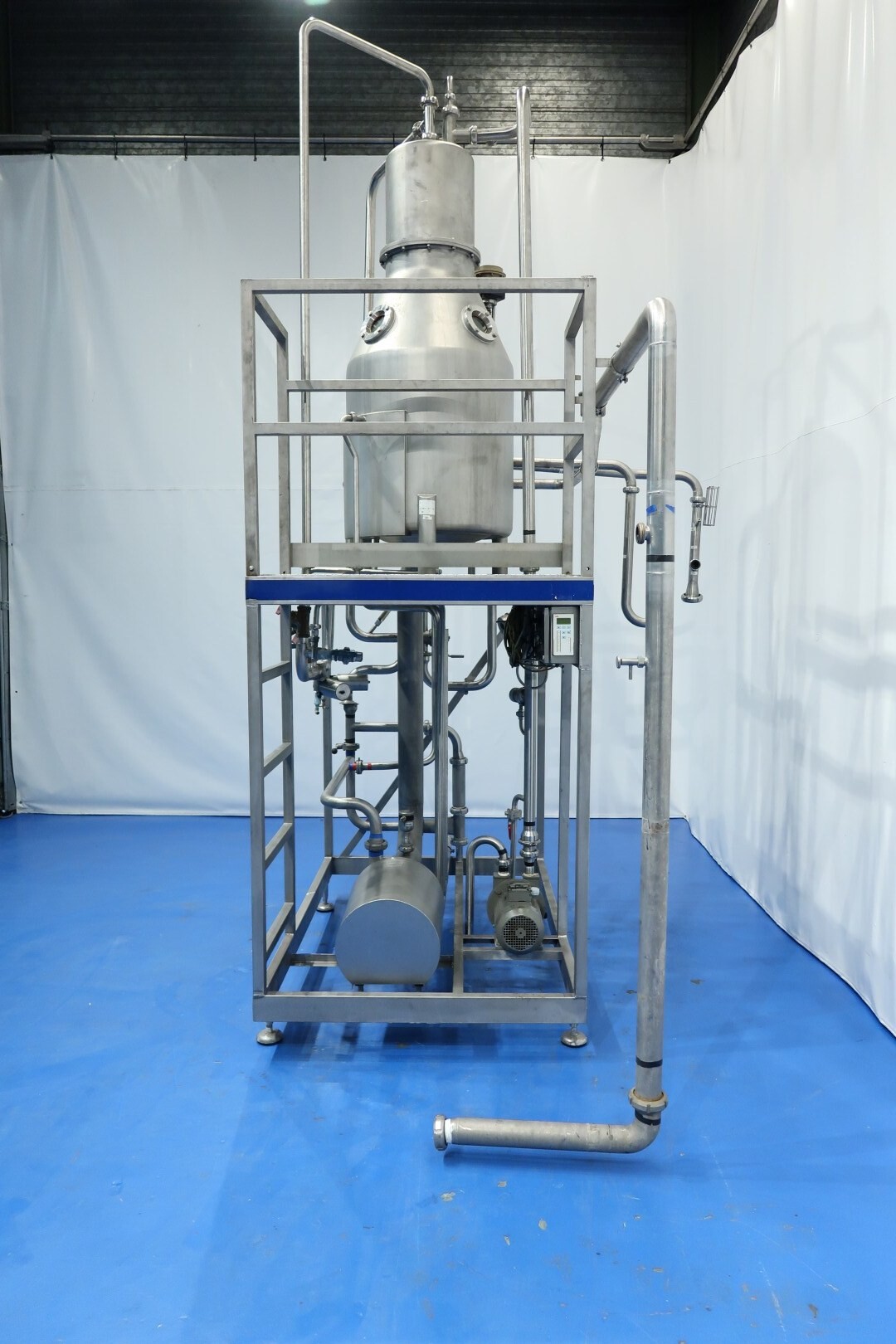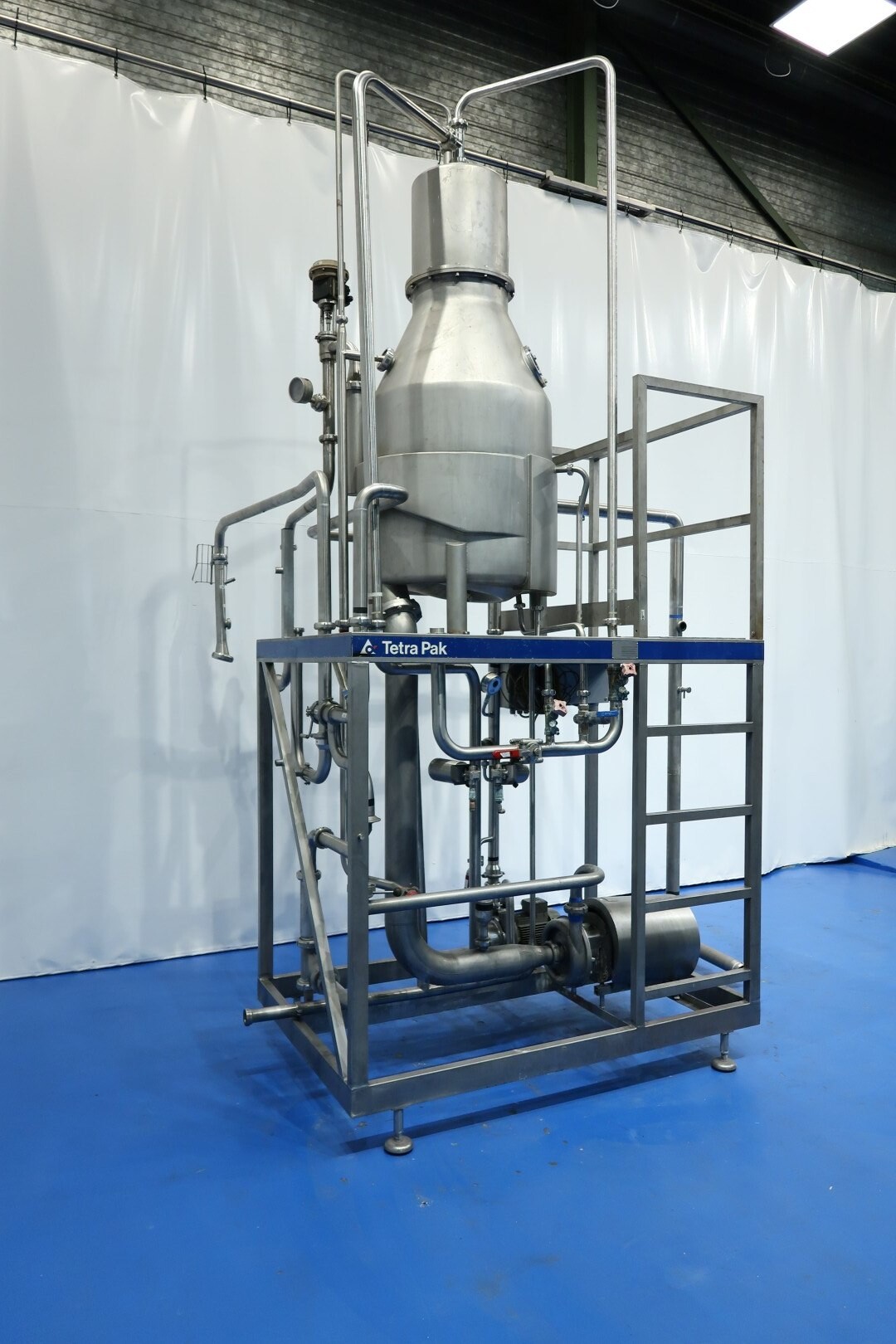 Tank met tangentiële (zij-)inlaat, gedeeltelijk dubbelwandig uitgevoerd, voorzien van vacuümpomp, manometer, handmatig bediende vacuümregelklep en instelbare toevoerregelklep (momenteel ingesteld op 12.000 l/u).